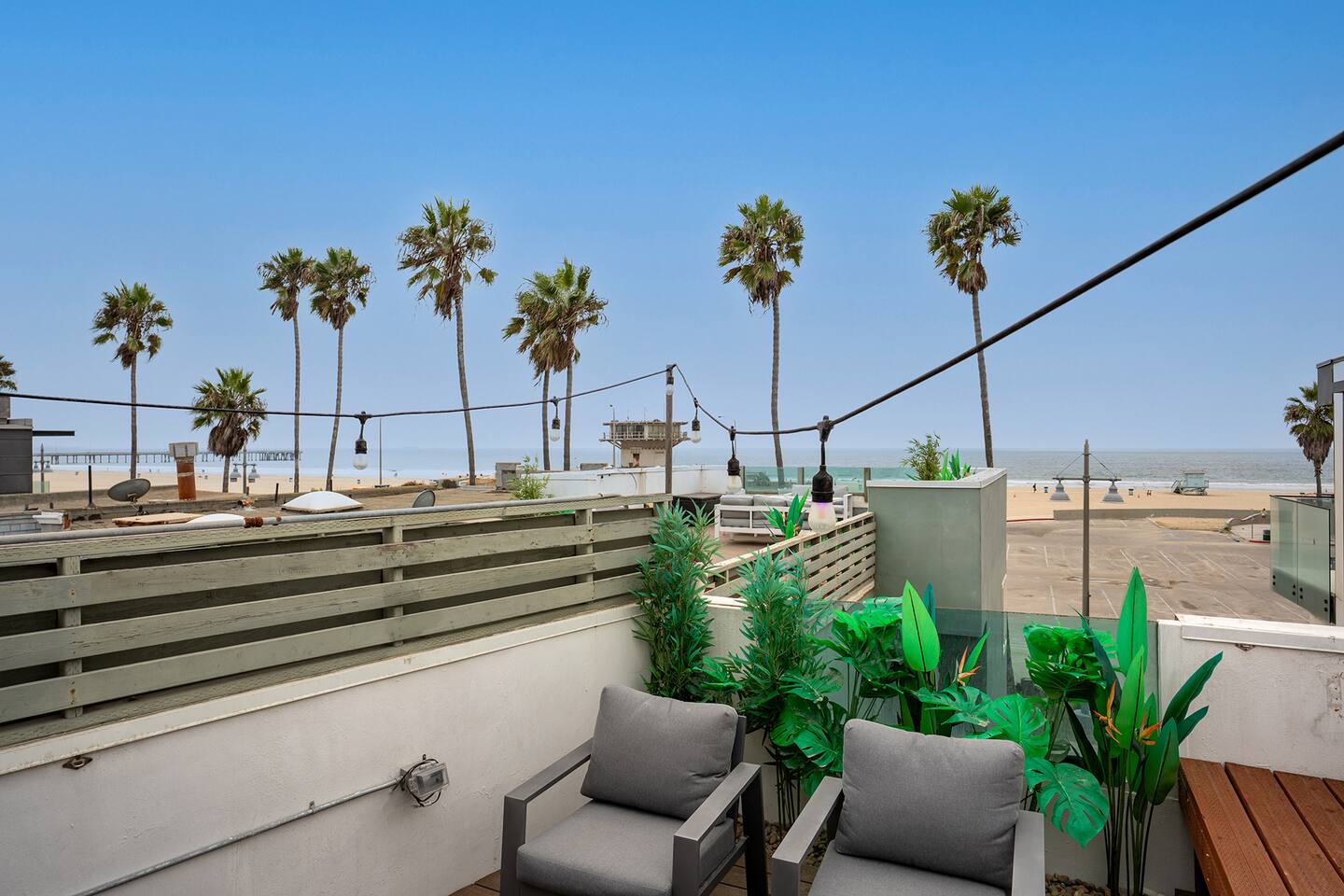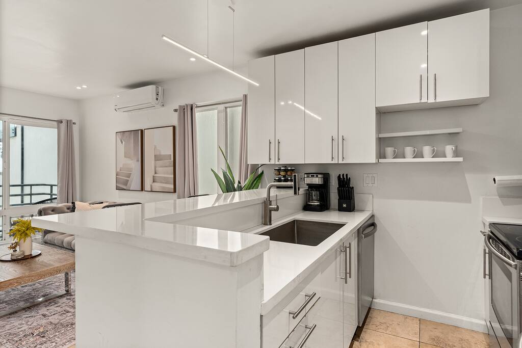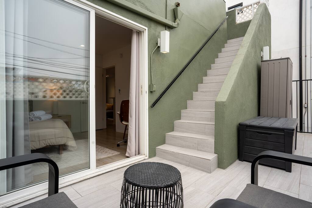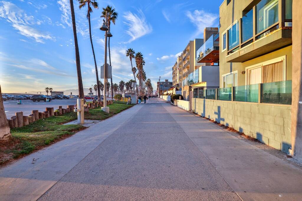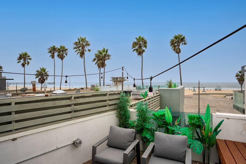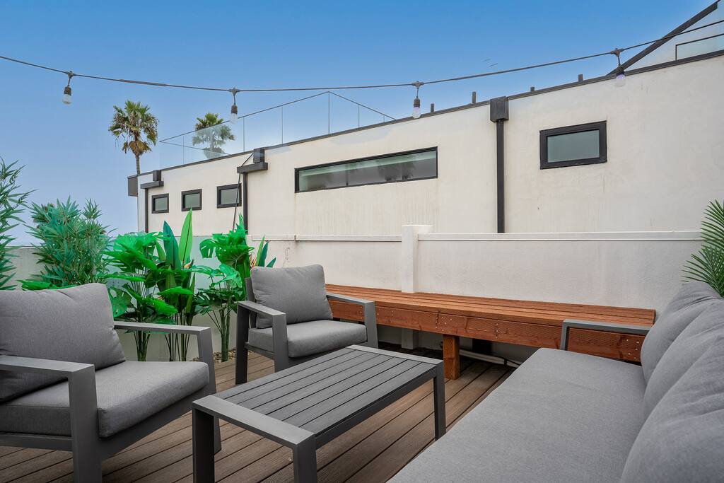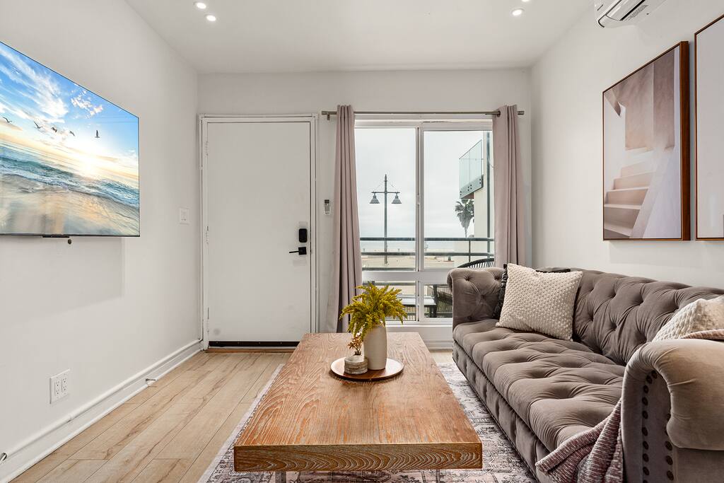 NEW LISTING! HOSTED BY SUPERHOST! Venice Beach Oceanfront Haven +Rooftop Deck Wake up to ocean views, salty air, and the rhythm of Venice Beach. This modern beachfront pad is all about sun, style, and easy California living. Sip coffee on your rooftop deck, steps from the sand and boardwalk. This contemporary home sits right on the sand, offering unbeatable access to the beach just steps from your door. With sleek architecture, large windows, and private balconies, the design captures the beauty of natural light and sweeping ocean views—creating a calm, coastal retreat that feels both stylish and effortless. 30-night minimum stay. Choose 31 nights to waive city tax. The space Inside, the living room is bright and inviting, featuring a plush sofa, smart TV, and sliding glass doors that open to the ocean breeze. Minimalist décor and soft tones create a relaxing atmosphere perfect for both entertaining and downtime. The fully equipped kitchen includes white quartz countertops, stainless steel appliances, and a breakfast bar ideal for casual dining. Every detail is designed for comfort and convenience, whether you’re preparing a home-cooked meal or enjoying takeout from one of Venice’s local spots. The bedroom offers a cozy queen-sized bed with soft linens, a workspace for remote guests, and sliding doors leading to a private balcony that fills the room with natural light. The bathroom features a glass-enclosed shower and tub, white subway tiles, and fresh towels for a clean, spa-like experience. Modern convenience meets coastal comfort with washer and dryer, neatly tucked away for easy access. Perfect for longer stays, you can enjoy fresh laundry anytime while relaxing in this stylish Venice Beach home. Outdoor spaces Step out to your furnished balcony to enjoy morning coffee or evening cocktails with sweeping ocean views. Upstairs, your private rooftop deck provides even more space to lounge, sunbathe, or watch the sunset over the water. Private gated parking ensures convenience and peace of mind throughout your stay. Location Located in the heart of Venice, this home places you steps from the world-famous Venice Beach Boardwalk, Muscle Beach Gym, the charming Venice Canals, and Abbot Kinney Boulevard’s boutique shops, cafés, and restaurants. Whether you’re here to relax by the ocean, explore local art, or experience the vibrant coastal energy, this home offers everything you need for a comfortable and memorable stay. Guest access Guests have exclusive access to the entire home, including the private rooftop deck, balcony, and secured gated parking. The property is fully self-contained, providing all the essentials for a seamless extended stay. Other things to note • 30-night minimum stay; choose 31 nights to waive city tax. • The property is located on the beachfront with occasional activity from passersby on the boardwalk below. • Quiet hours are from 10 p.m. to 8 a.m. • No parties or large gatherings. • A starter supply of essentials (toiletries, paper products, and kitchen basics) is provided. • Weekly or biweekly cleanings can be arranged upon request for longer stays. Please note: The parking space is designed for compact vehicles and has limited maneuvering room.