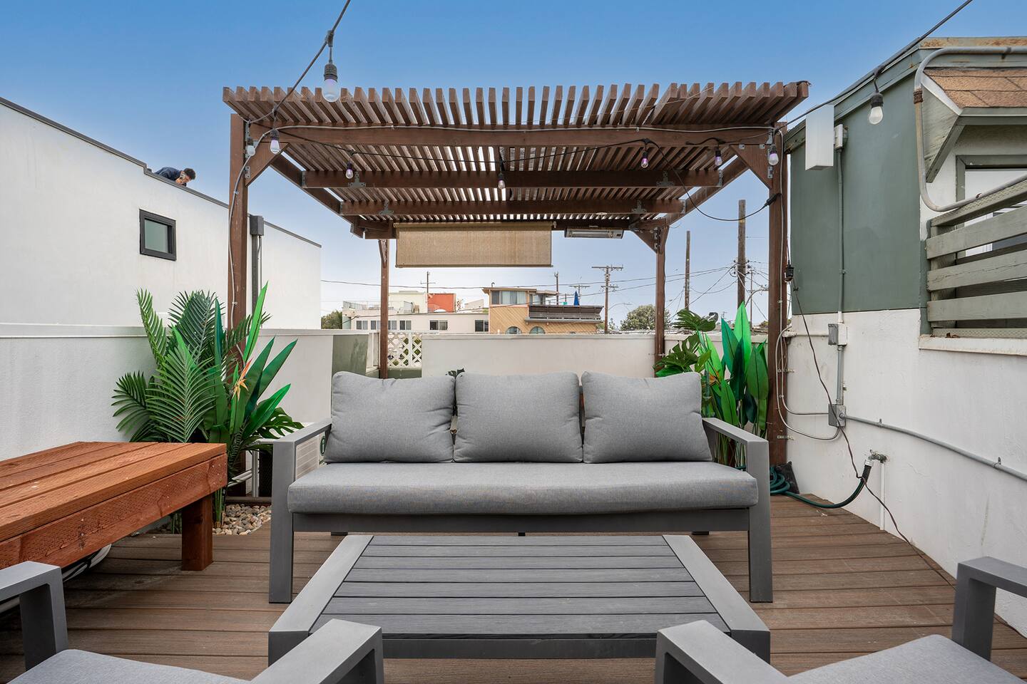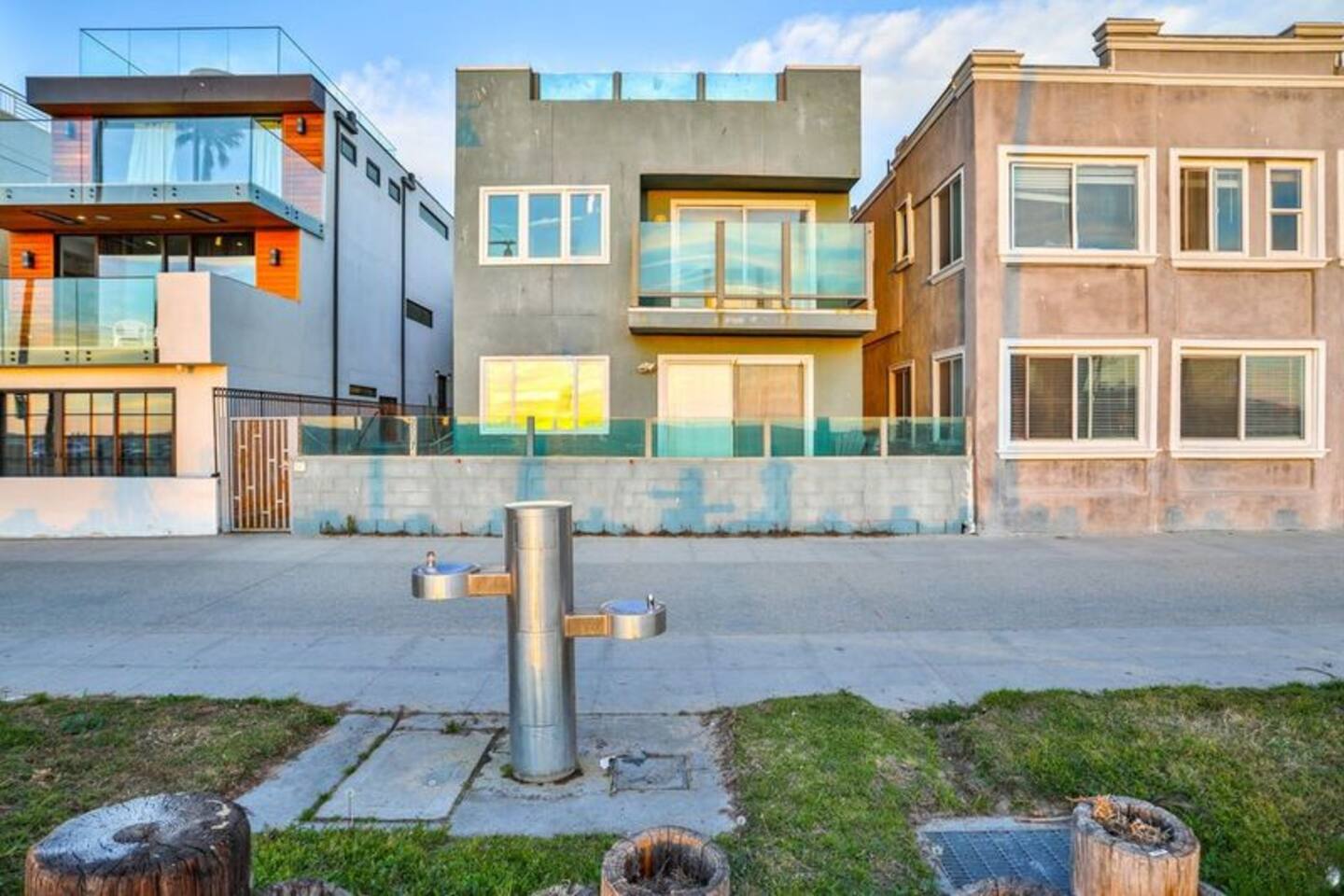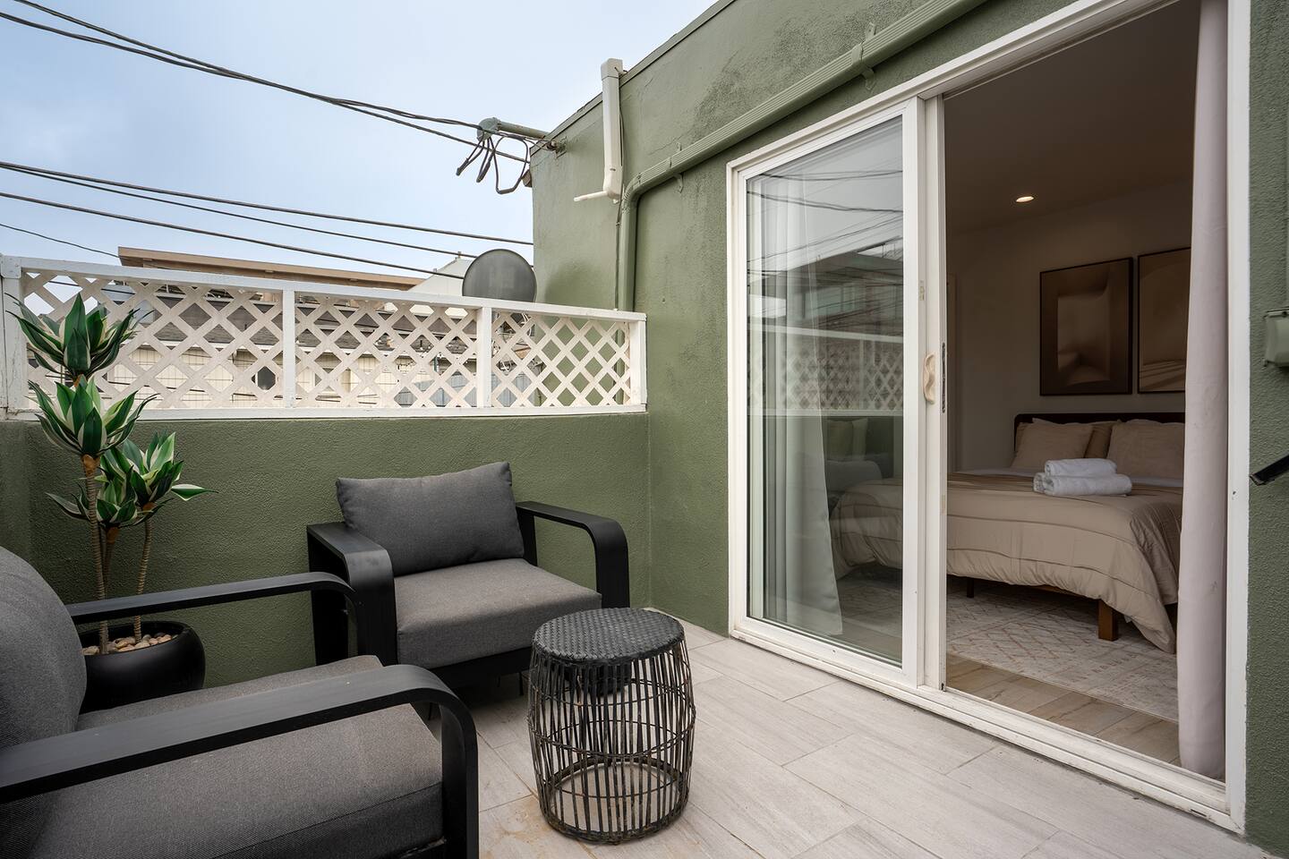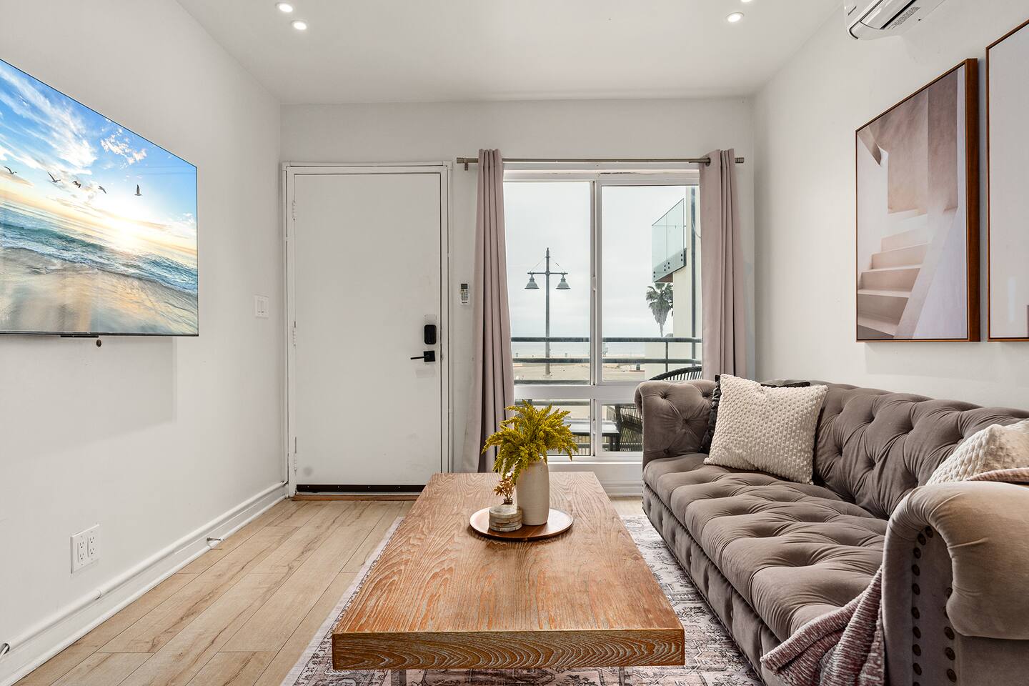 NEW LISTING! HOSTED BY SUPERHOST! Venice Beach Oceanfront Haven +Rooftop Deck Wake up to ocean views, salty air, and the rhythm of Venice Beach. This modern beachfront pad is all about sun, style, and easy California living. Sip coffee on your rooftop deck, steps from the sand and boardwalk. This contemporary home sits right on the sand, offering unbeatable access to the beach just steps from your door. With sleek architecture, large windows, and private balconies, the design captures the beauty of natural light and sweeping ocean views—creating a calm, coastal retreat that feels both stylish and effortless. 30-night minimum stay. Choose 31 nights to waive city tax. The space Inside, the living room is bright and inviting, featuring a plush sofa, smart TV, and sliding glass doors that open to the ocean breeze. Minimalist décor and soft tones create a relaxing atmosphere perfect for both entertaining and downtime. The fully equipped kitchen includes white quartz countertops, stainless steel appliances, and a breakfast bar ideal for casual dining. Every detail is designed for comfort and convenience, whether you’re preparing a home-cooked meal or enjoying takeout from one of Venice’s local spots. The bedroom offers a cozy queen-sized bed with soft linens, a workspace for remote guests, and sliding doors leading to a private balcony that fills the room with natural light. The bathroom features a glass-enclosed shower and tub, white subway tiles, and fresh towels for a clean, spa-like experience. Modern convenience meets coastal comfort with washer and dryer, neatly tucked away for easy access. Perfect for longer stays, you can enjoy fresh laundry anytime while relaxing in this stylish Venice Beach home. Outdoor spaces Step out to your furnished balcony to enjoy morning coffee or evening cocktails with sweeping ocean views. Upstairs, your private rooftop deck provides even more space to lounge, sunbathe, or watch the sunset over the water. Private gated parking ensures convenience and peace of mind throughout your stay. Location Located in the heart of Venice, this home places you steps from the world-famous Venice Beach Boardwalk, Muscle Beach Gym, the charming Venice Canals, and Abbot Kinney Boulevard’s boutique shops, cafés, and restaurants. Whether you’re here to relax by the ocean, explore local art, or experience the vibrant coastal energy, this home offers everything you need for a comfortable and memorable stay. Guest access Guests have exclusive access to the entire home, including the private rooftop deck, balcony, and secured gated parking. The property is fully self-contained, providing all the essentials for a seamless extended stay. Other things to note • 30-night minimum stay; choose 31 nights to waive city tax. • The property is located on the beachfront with occasional activity from passersby on the boardwalk below. • Quiet hours are from 10 p.m. to 8 a.m. • No parties or large gatherings. • A starter supply of essentials (toiletries, paper products, and kitchen basics) is provided. • Weekly or biweekly cleanings can be arranged upon request for longer stays. Please note: The parking space is designed for compact vehicles and has limited maneuvering room.