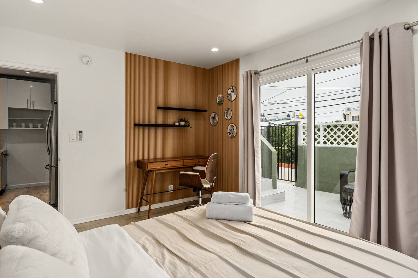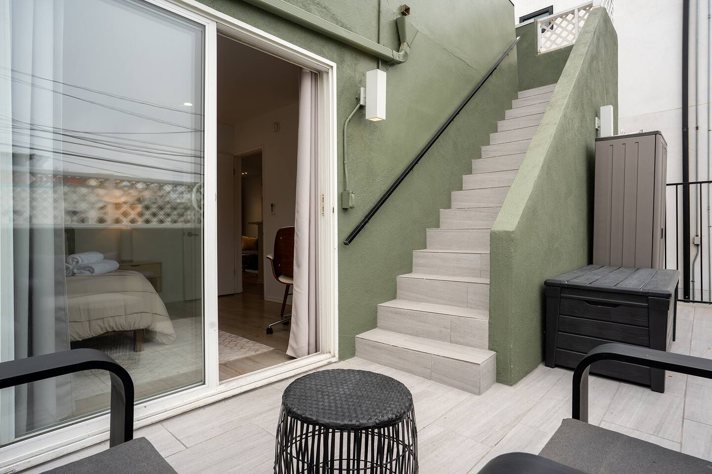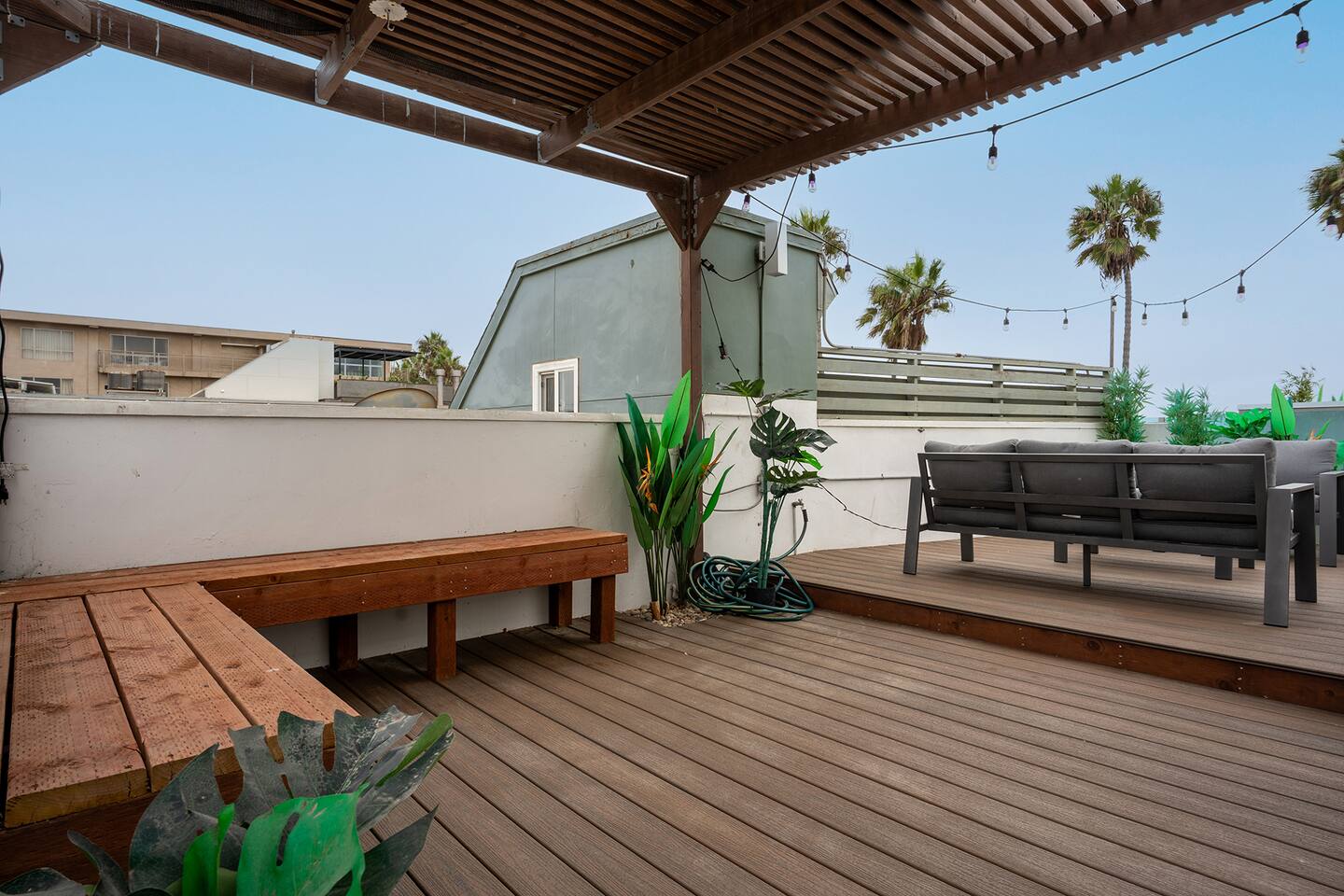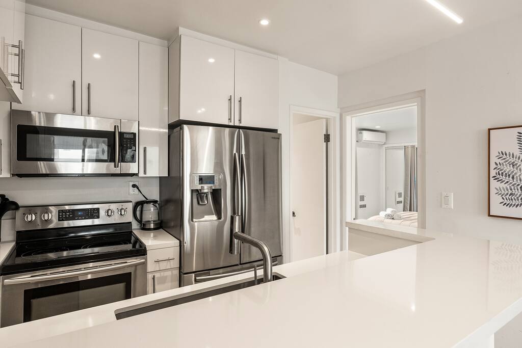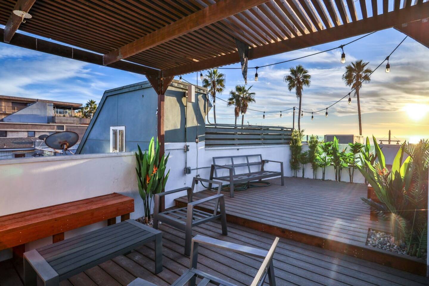 NEW LISTING! HOSTED BY SUPERHOST! Venice Beach Oceanfront Haven +Rooftop Deck Wake up to ocean views, salty air, and the rhythm of Venice Beach. This modern beachfront pad is all about sun, style, and easy California living. Sip coffee on your rooftop deck, steps from the sand and boardwalk. This contemporary home sits right on the sand, offering unbeatable access to the beach just steps from your door. With sleek architecture, large windows, and private balconies, the design captures the beauty of natural light and sweeping ocean views—creating a calm, coastal retreat that feels both stylish and effortless. 30-night minimum stay. Choose 31 nights to waive city tax. The space Inside, the living room is bright and inviting, featuring a plush sofa, smart TV, and sliding glass doors that open to the ocean breeze. Minimalist décor and soft tones create a relaxing atmosphere perfect for both entertaining and downtime. The fully equipped kitchen includes white quartz countertops, stainless steel appliances, and a breakfast bar ideal for casual dining. Every detail is designed for comfort and convenience, whether you’re preparing a home-cooked meal or enjoying takeout from one of Venice’s local spots. The bedroom offers a cozy queen-sized bed with soft linens, a workspace for remote guests, and sliding doors leading to a private balcony that fills the room with natural light. The bathroom features a glass-enclosed shower and tub, white subway tiles, and fresh towels for a clean, spa-like experience. Modern convenience meets coastal comfort with washer and dryer, neatly tucked away for easy access. Perfect for longer stays, you can enjoy fresh laundry anytime while relaxing in this stylish Venice Beach home. Outdoor spaces Step out to your furnished balcony to enjoy morning coffee or evening cocktails with sweeping ocean views. Upstairs, your private rooftop deck provides even more space to lounge, sunbathe, or watch the sunset over the water. Private gated parking ensures convenience and peace of mind throughout your stay. Location Located in the heart of Venice, this home places you steps from the world-famous Venice Beach Boardwalk, Muscle Beach Gym, the charming Venice Canals, and Abbot Kinney Boulevard’s boutique shops, cafés, and restaurants. Whether you’re here to relax by the ocean, explore local art, or experience the vibrant coastal energy, this home offers everything you need for a comfortable and memorable stay. Guest access Guests have exclusive access to the entire home, including the private rooftop deck, balcony, and secured gated parking. The property is fully self-contained, providing all the essentials for a seamless extended stay. Other things to note • 30-night minimum stay; choose 31 nights to waive city tax. • The property is located on the beachfront with occasional activity from passersby on the boardwalk below. • Quiet hours are from 10 p.m. to 8 a.m. • No parties or large gatherings. • A starter supply of essentials (toiletries, paper products, and kitchen basics) is provided. • Weekly or biweekly cleanings can be arranged upon request for longer stays. Please note: The parking space is designed for compact vehicles and has limited maneuvering room.