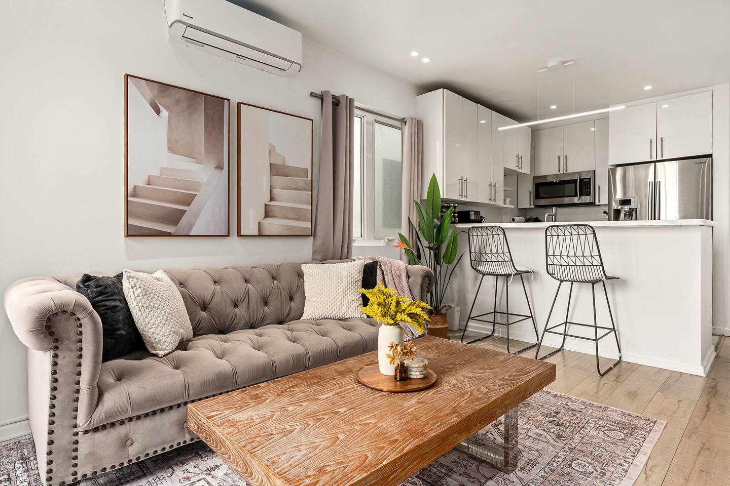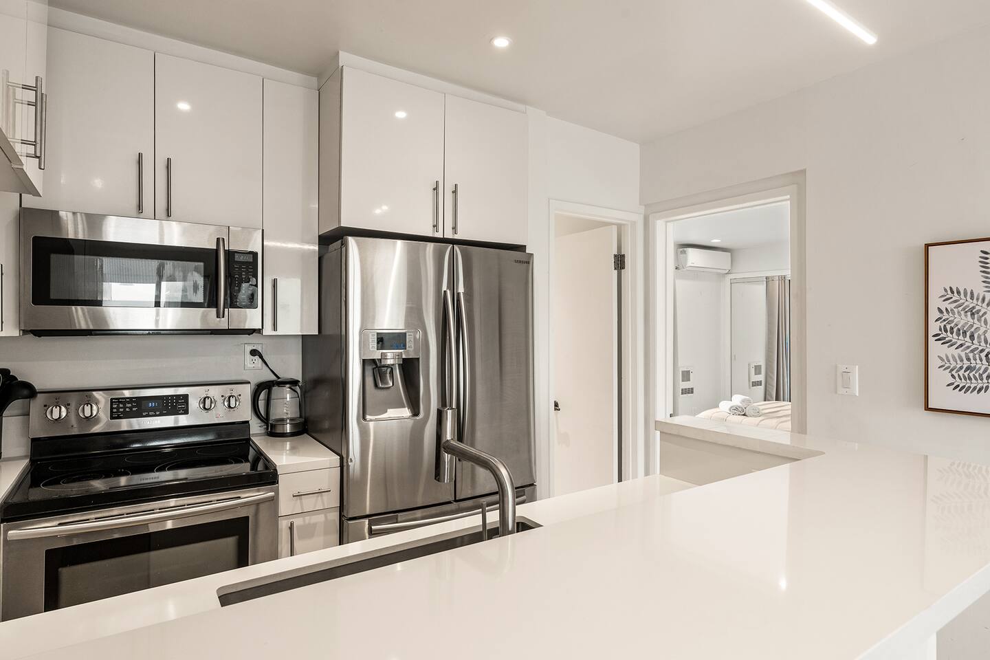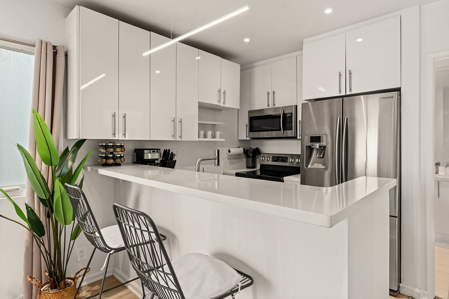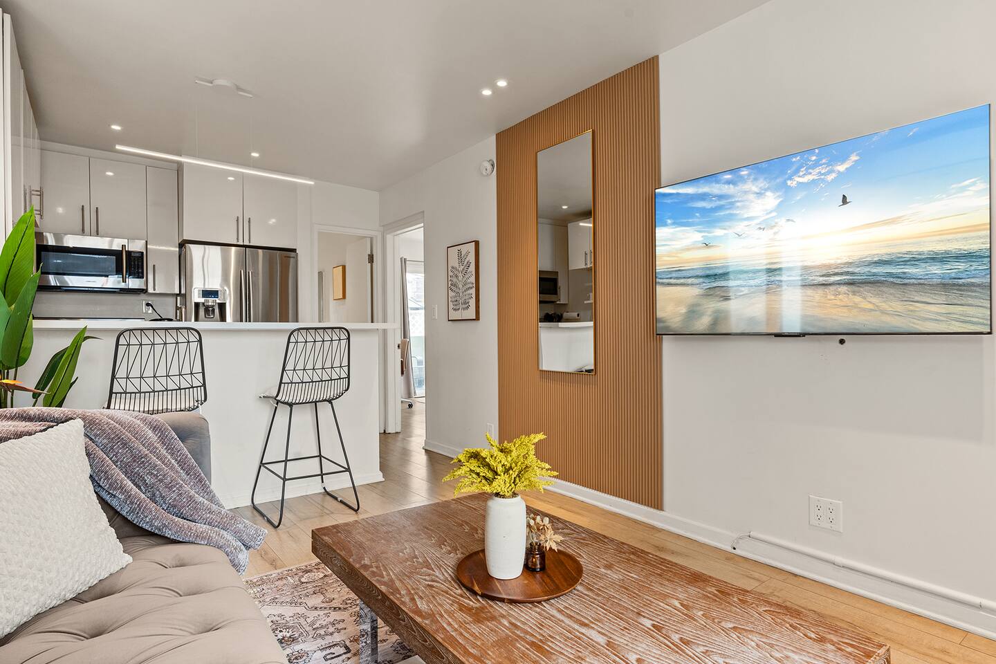 NEW LISTING! HOSTED BY SUPERHOST! Venice Beach Oceanfront Haven +Rooftop Deck Wake up to ocean views, salty air, and the rhythm of Venice Beach. This modern beachfront pad is all about sun, style, and easy California living. Sip coffee on your rooftop deck, steps from the sand and boardwalk. This contemporary home sits right on the sand, offering unbeatable access to the beach just steps from your door. With sleek architecture, large windows, and private balconies, the design captures the beauty of natural light and sweeping ocean views—creating a calm, coastal retreat that feels both stylish and effortless. 30-night minimum stay. Choose 31 nights to waive city tax. The space Inside, the living room is bright and inviting, featuring a plush sofa, smart TV, and sliding glass doors that open to the ocean breeze. Minimalist décor and soft tones create a relaxing atmosphere perfect for both entertaining and downtime. The fully equipped kitchen includes white quartz countertops, stainless steel appliances, and a breakfast bar ideal for casual dining. Every detail is designed for comfort and convenience, whether you’re preparing a home-cooked meal or enjoying takeout from one of Venice’s local spots. The bedroom offers a cozy queen-sized bed with soft linens, a workspace for remote guests, and sliding doors leading to a private balcony that fills the room with natural light. The bathroom features a glass-enclosed shower and tub, white subway tiles, and fresh towels for a clean, spa-like experience. Modern convenience meets coastal comfort with washer and dryer, neatly tucked away for easy access. Perfect for longer stays, you can enjoy fresh laundry anytime while relaxing in this stylish Venice Beach home. Outdoor spaces Step out to your furnished balcony to enjoy morning coffee or evening cocktails with sweeping ocean views. Upstairs, your private rooftop deck provides even more space to lounge, sunbathe, or watch the sunset over the water. Private gated parking ensures convenience and peace of mind throughout your stay. Location Located in the heart of Venice, this home places you steps from the world-famous Venice Beach Boardwalk, Muscle Beach Gym, the charming Venice Canals, and Abbot Kinney Boulevard’s boutique shops, cafés, and restaurants. Whether you’re here to relax by the ocean, explore local art, or experience the vibrant coastal energy, this home offers everything you need for a comfortable and memorable stay. Guest access Guests have exclusive access to the entire home, including the private rooftop deck, balcony, and secured gated parking. The property is fully self-contained, providing all the essentials for a seamless extended stay. Other things to note • 30-night minimum stay; choose 31 nights to waive city tax. • The property is located on the beachfront with occasional activity from passersby on the boardwalk below. • Quiet hours are from 10 p.m. to 8 a.m. • No parties or large gatherings. • A starter supply of essentials (toiletries, paper products, and kitchen basics) is provided. • Weekly or biweekly cleanings can be arranged upon request for longer stays. Please note: The parking space is designed for compact vehicles and has limited maneuvering room.