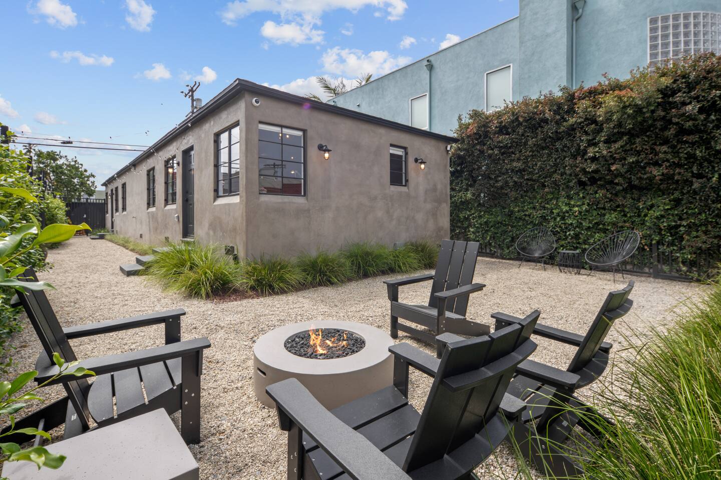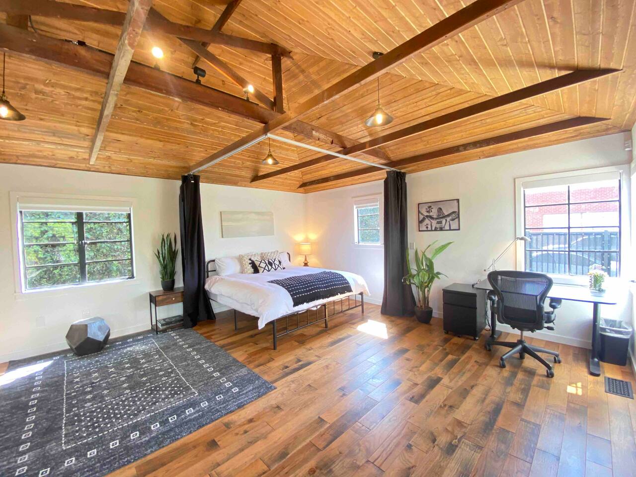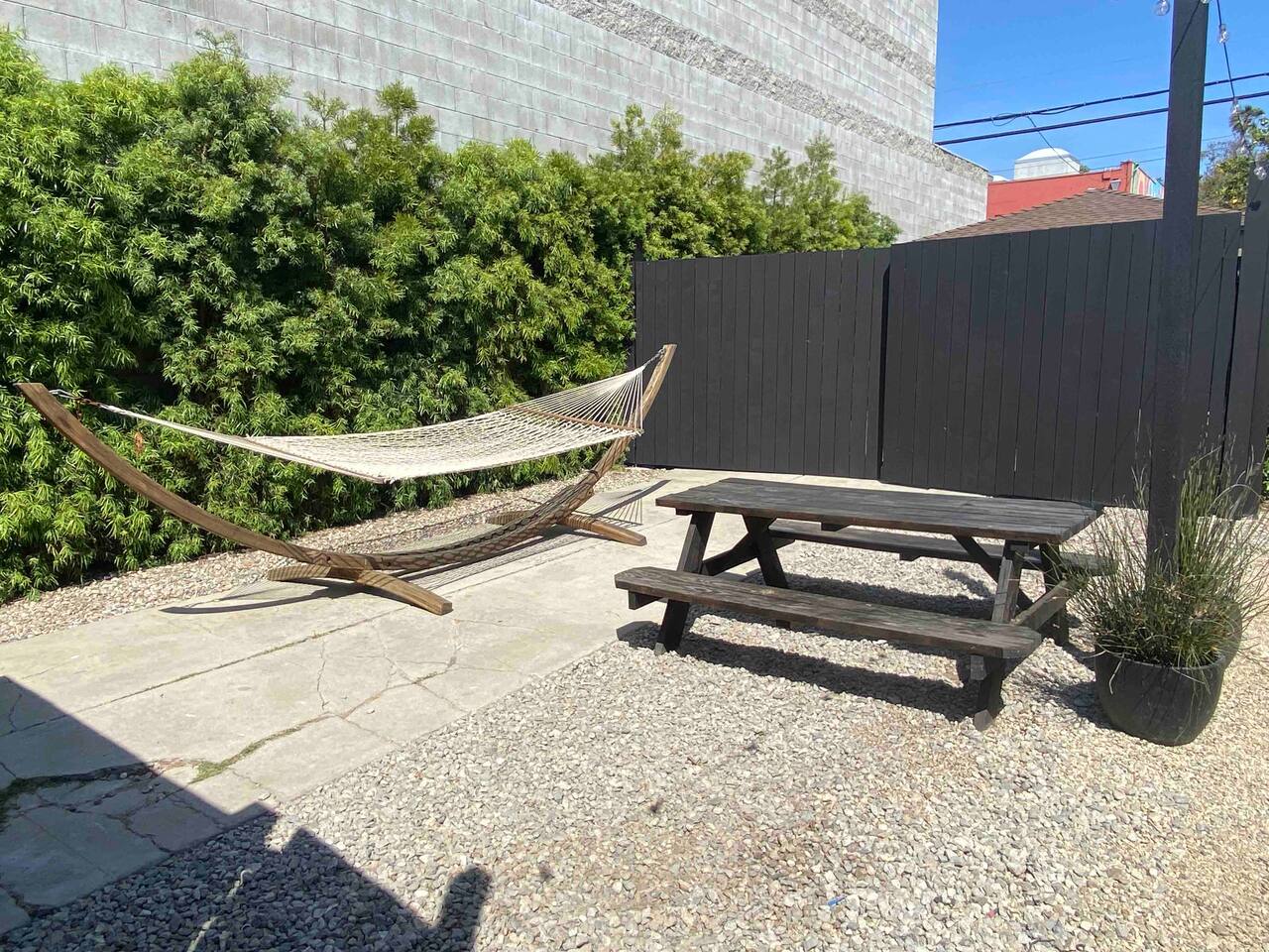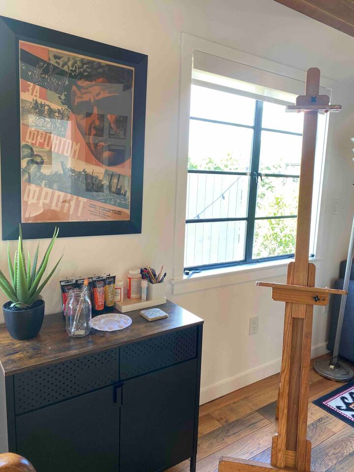 Your Venice Beach Bungalow Retreat Stay in the heart of Venice, just steps from Abbott Kinney, in this freshly renovated 1-bedroom bungalow full of character and light. Walk into a bright, open living room with soaring wood ceilings, hardwood floors, and tons of natural light. The space flows right out to a private outdoor lounge with a fire pit, shaded by trees, a perfect spot for morning coffee or late-night hangs. The main sleeping area has a king-size bed you can enclose with blackout curtains for privacy. There’s also a desk for work, a cozy second bedroom with a twin bed, and plenty of creative touches—an electric guitar, bongo, and even an art stand with paints if inspiration strikes. The kitchen is fully stocked with pro-grade appliances, stone countertops, and everything you need to cook. You’ll also have fresh linens, eco-friendly soaps, beach towels, smart TV, and fast WiFi to keep you connected. And best of all, the whole place is yours! No shared spaces, private garage parking included. This is your own little slice of Venice: modern, artsy, and just a short stroll to the beach, shops, and restaurants.