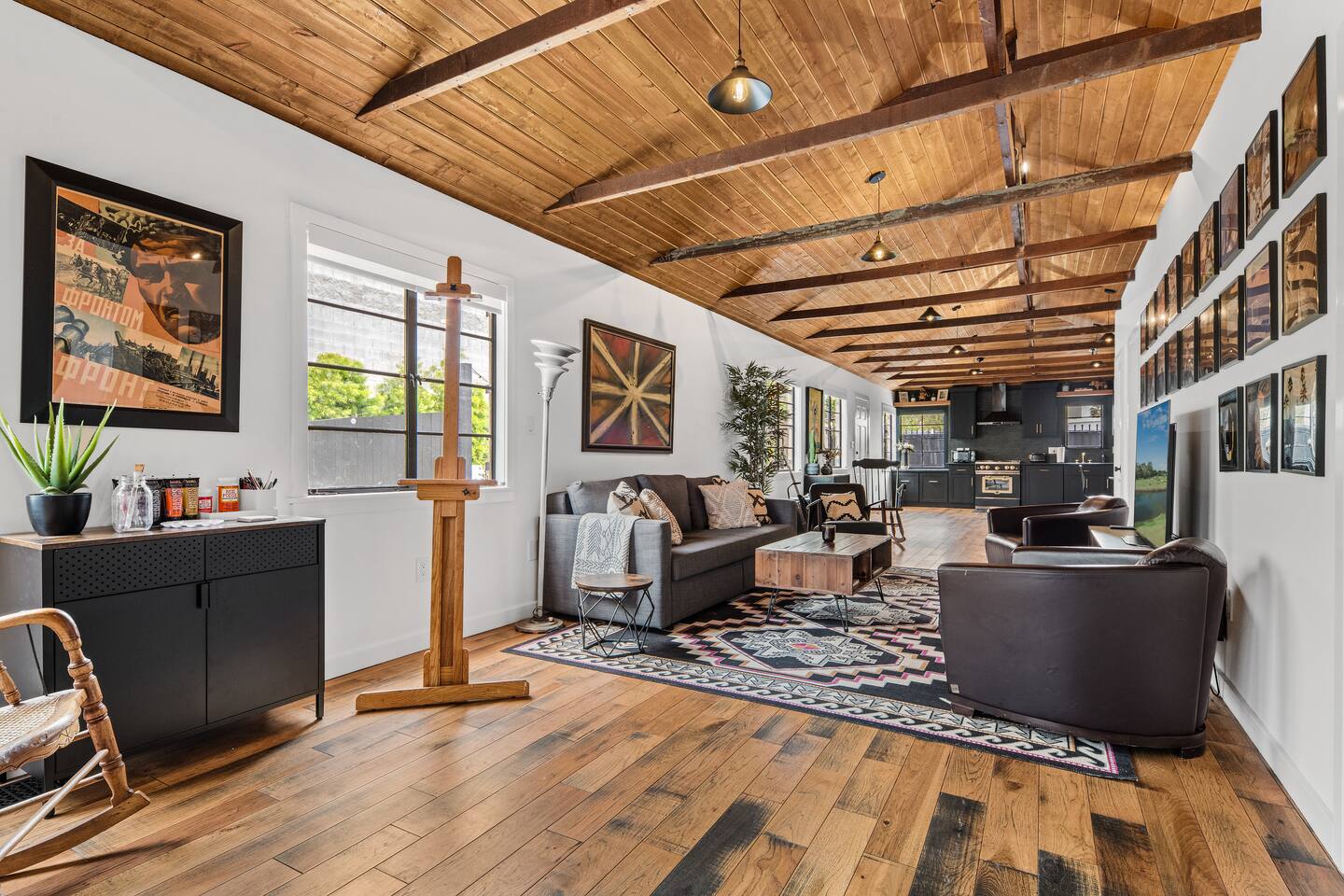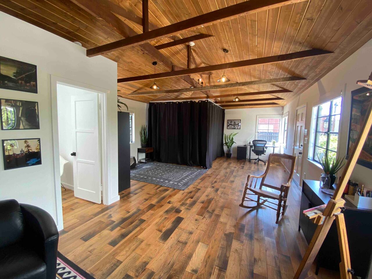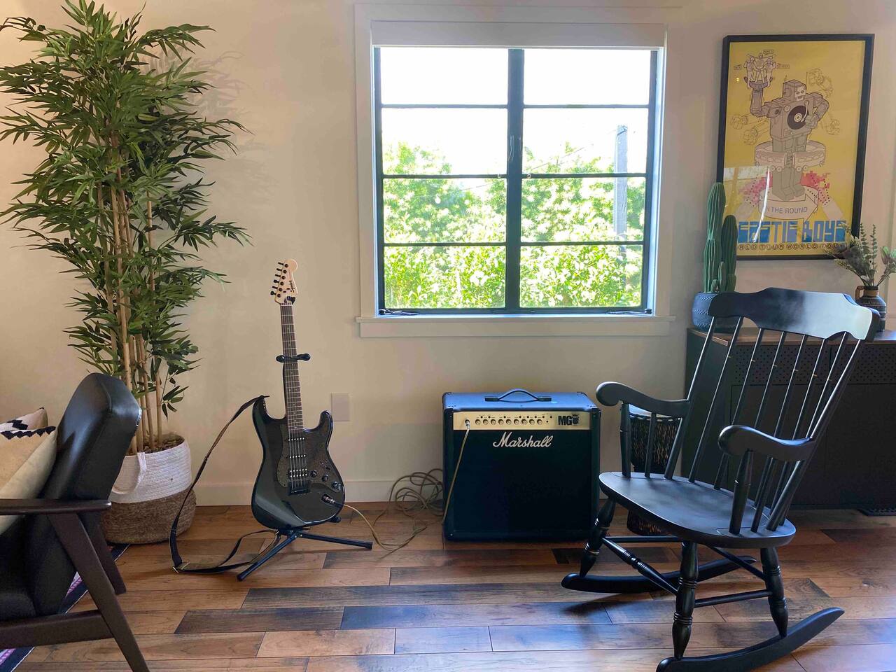Your Venice Beach Bungalow Retreat Stay in the heart of Venice, just steps from Abbott Kinney, in this freshly renovated 1-bedroom bungalow full of character and light. Walk into a bright, open living room with soaring wood ceilings, hardwood floors, and tons of natural light. The space flows right out to a private outdoor lounge with a fire pit, shaded by trees, a perfect spot for morning coffee or late-night hangs. The main sleeping area has a king-size bed you can enclose with blackout curtains for privacy. There’s also a desk for work, a cozy second bedroom with a twin bed, and plenty of creative touches—an electric guitar, bongo, and even an art stand with paints if inspiration strikes. The kitchen is fully stocked with pro-grade appliances, stone countertops, and everything you need to cook. You’ll also have fresh linens, eco-friendly soaps, beach towels, smart TV, and fast WiFi to keep you connected. And best of all, the whole place is yours! No shared spaces, private garage parking included. This is your own little slice of Venice: modern, artsy, and just a short stroll to the beach, shops, and restaurants.