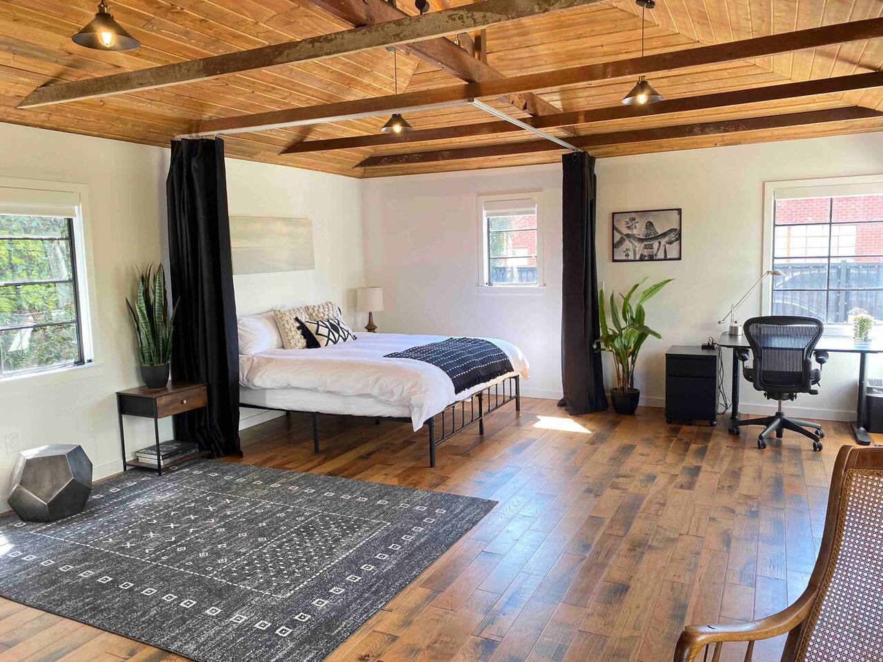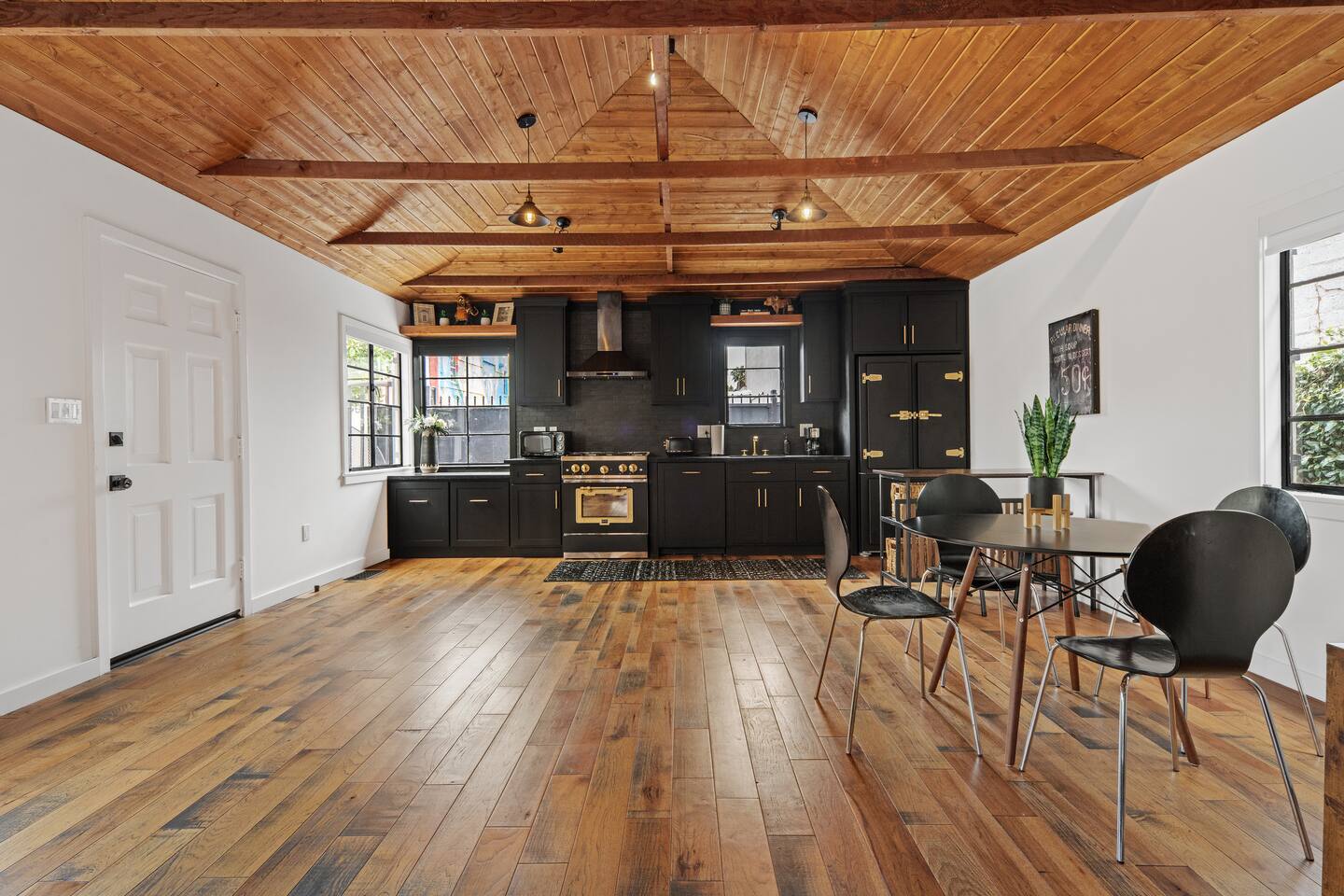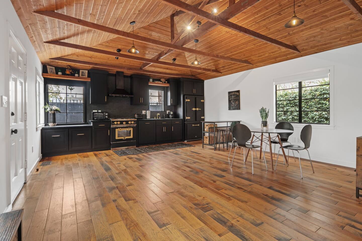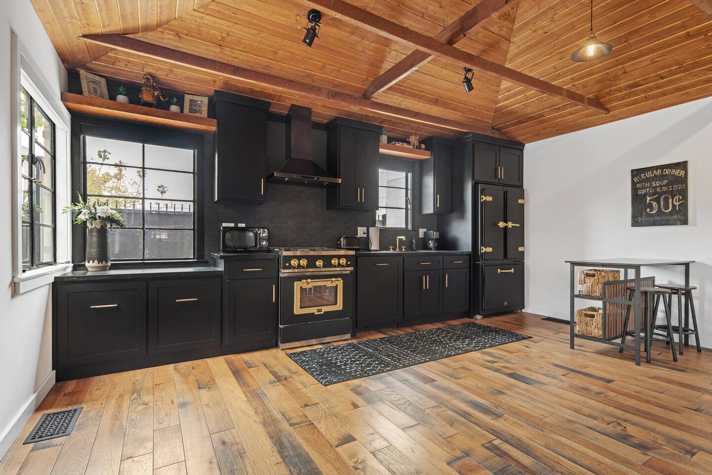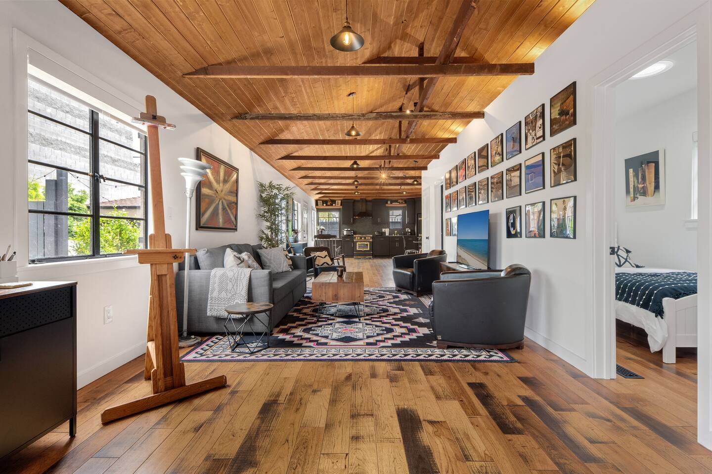 This unique bungalow is just off the famous Abbot Kinney. - Private, surrounded by lush greenery, with gated parking, outdoor seating, a fire pit, and a garage. - Open space with vaulted wooden ceilings, wood floors, and a sleek black kitchen with chef-grade appliances. Includes a 60" smart TV, electric guitar, and bongos - KING sized bed in the open space and a cozy twin bed in a separate bedroom **Book for 31 days or more and avoid city tax.**