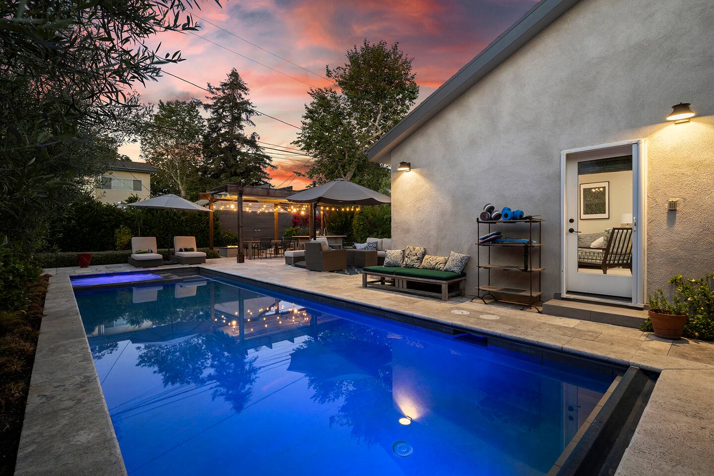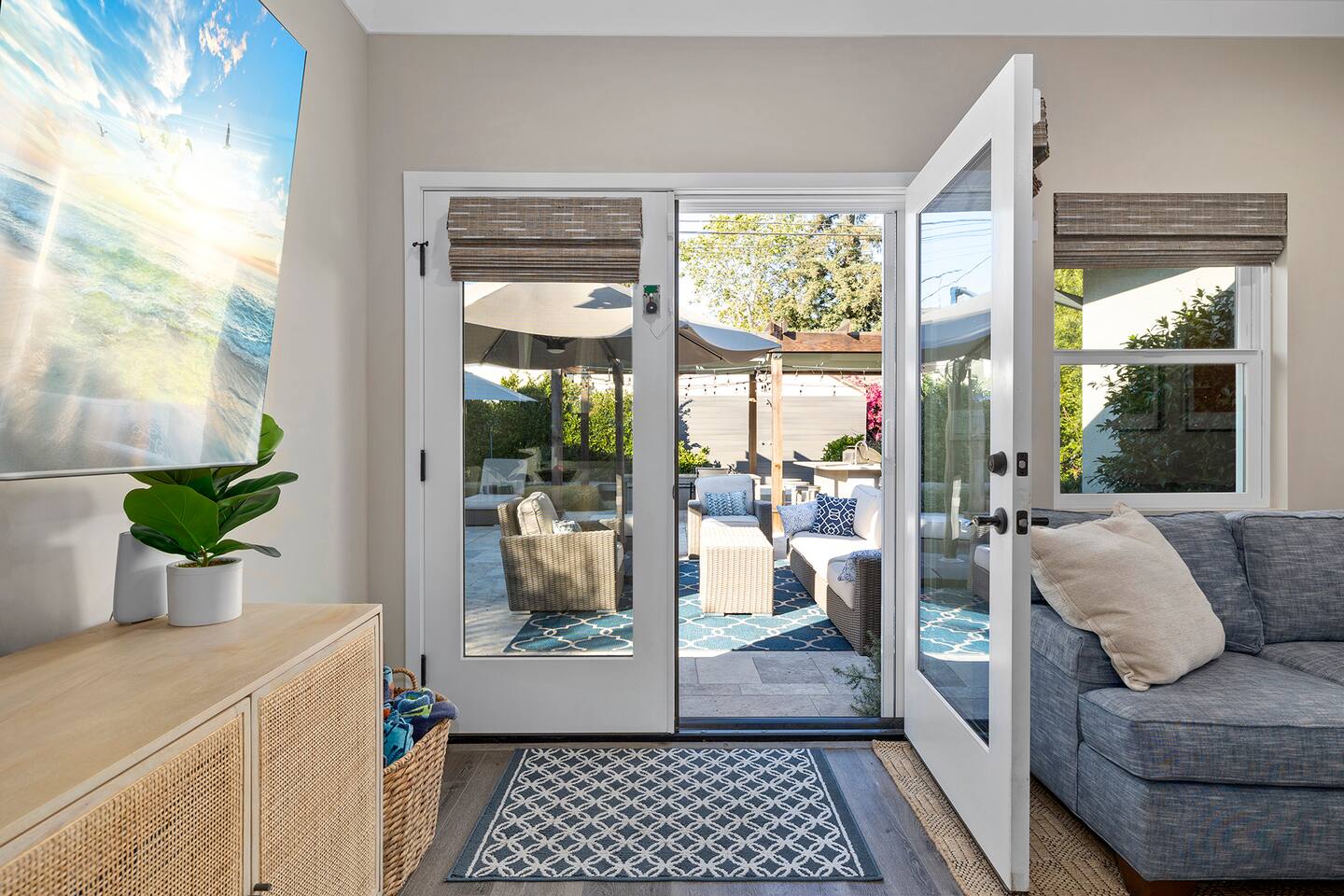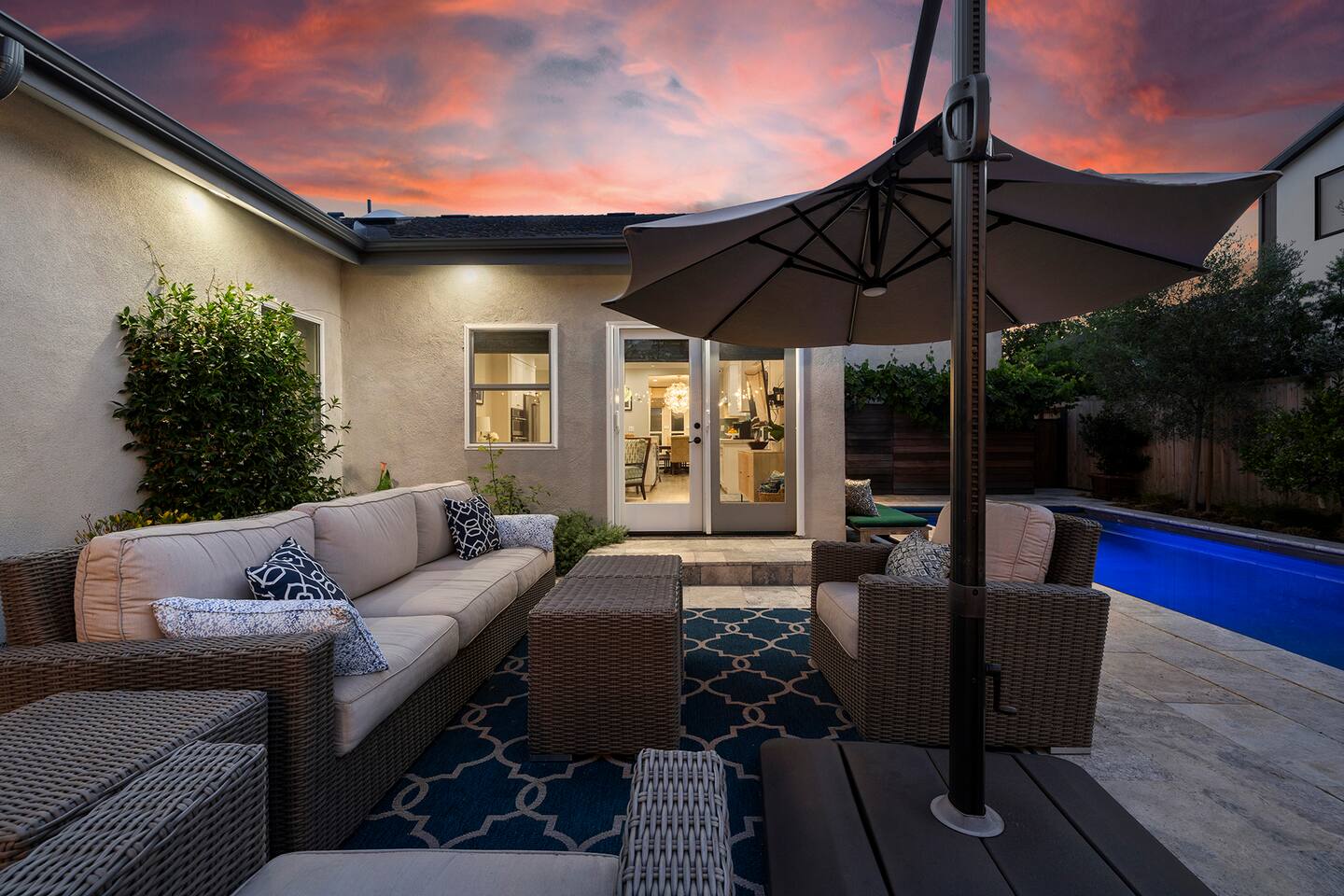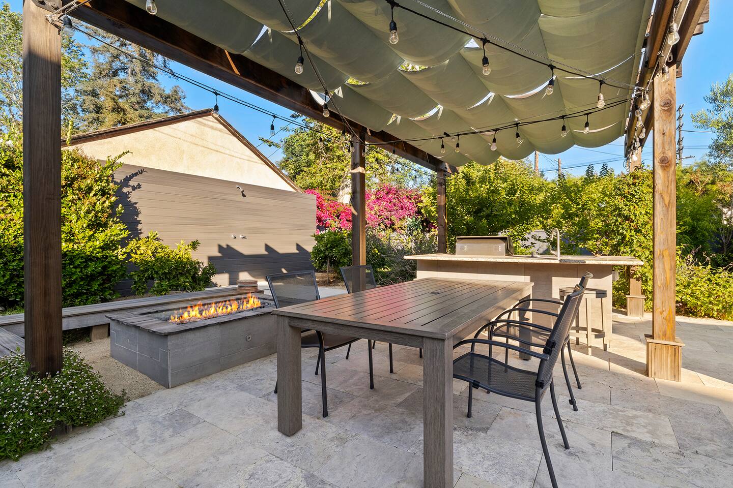 Discover modern living in Mar Vista! This home opens up to a beautiful garden with a heated pool and outdoor kitchen. Inside, relax by the fireplace, watch TV on the 60" flat-screen, or use the high-speed internet. The kitchen has sleek quartz countertops, and the master suite has its own bath and direct pool access. Two additional bedrooms offer comfortable queen beds. A perfect mix of indoor comfort and outdoor fun.