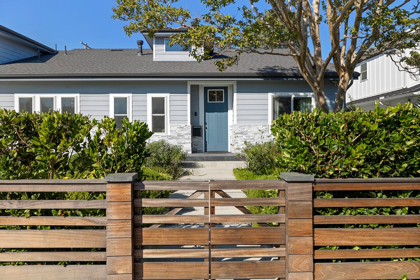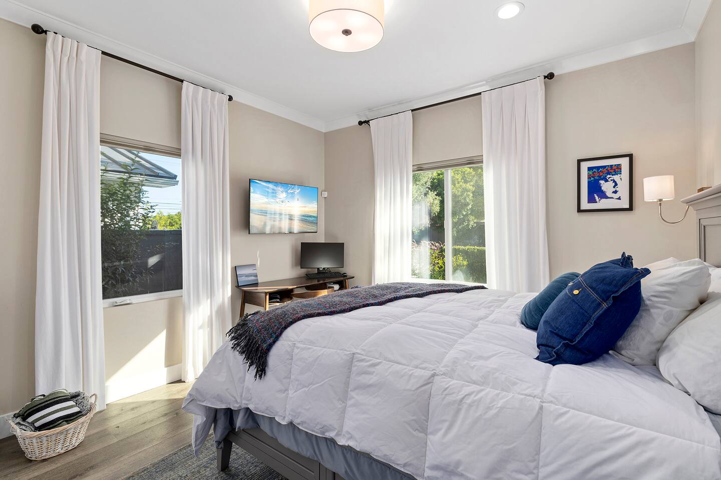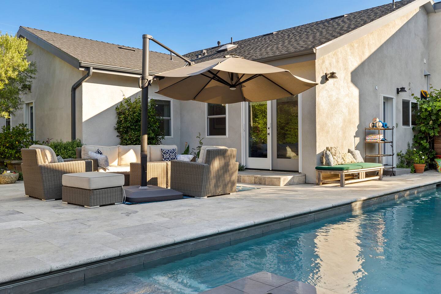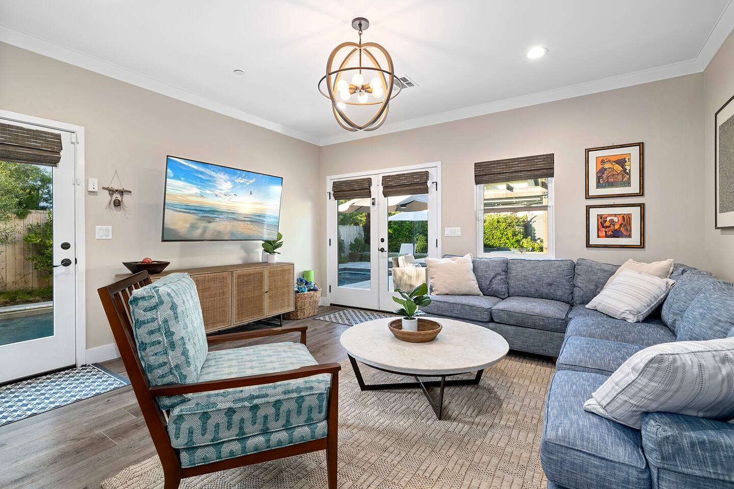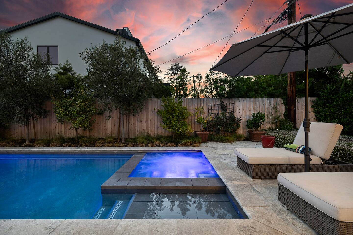 Discover modern living in Mar Vista! This home opens up to a beautiful garden with a heated pool and outdoor kitchen. Inside, relax by the fireplace, watch TV on the 60" flat-screen, or use the high-speed internet. The kitchen has sleek quartz countertops, and the master suite has its own bath and direct pool access. Two additional bedrooms offer comfortable queen beds. A perfect mix of indoor comfort and outdoor fun.