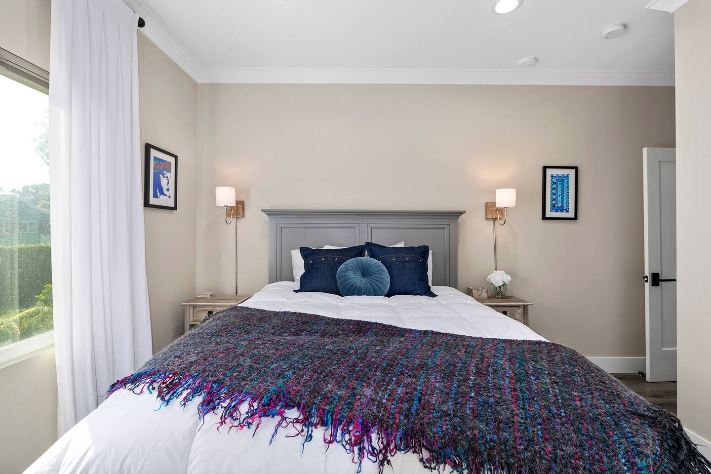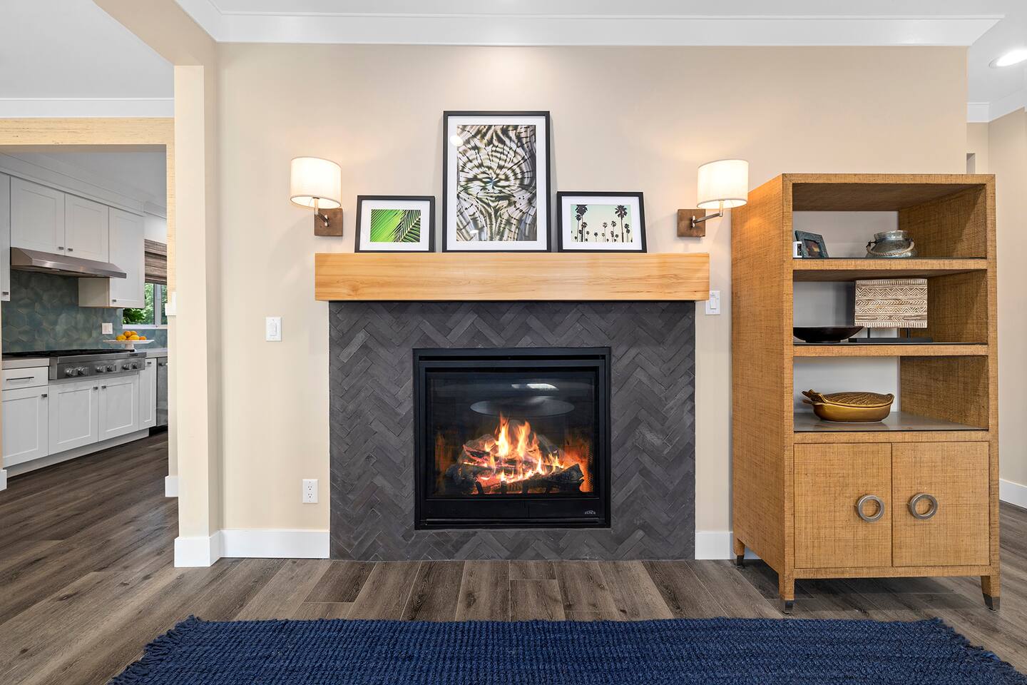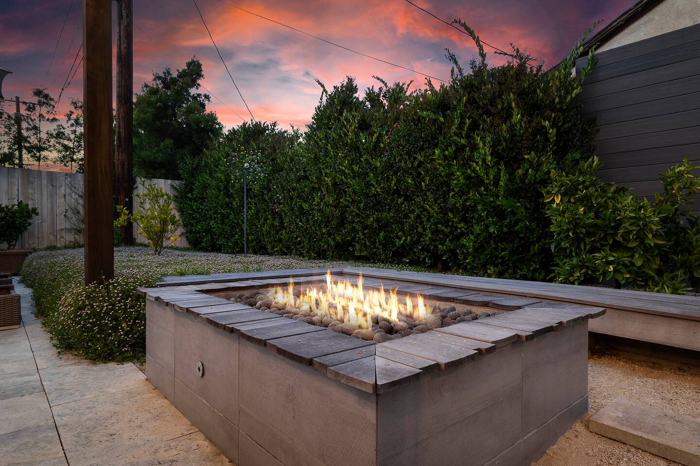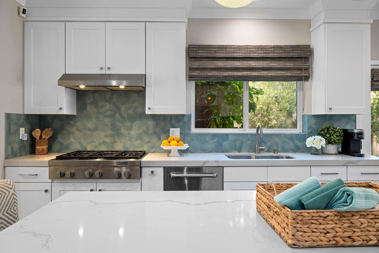 Discover modern living in Mar Vista! This home opens up to a beautiful garden with a heated pool and outdoor kitchen. Inside, relax by the fireplace, watch TV on the 60" flat-screen, or use the high-speed internet. The kitchen has sleek quartz countertops, and the master suite has its own bath and direct pool access. Two additional bedrooms offer comfortable queen beds. A perfect mix of indoor comfort and outdoor fun.