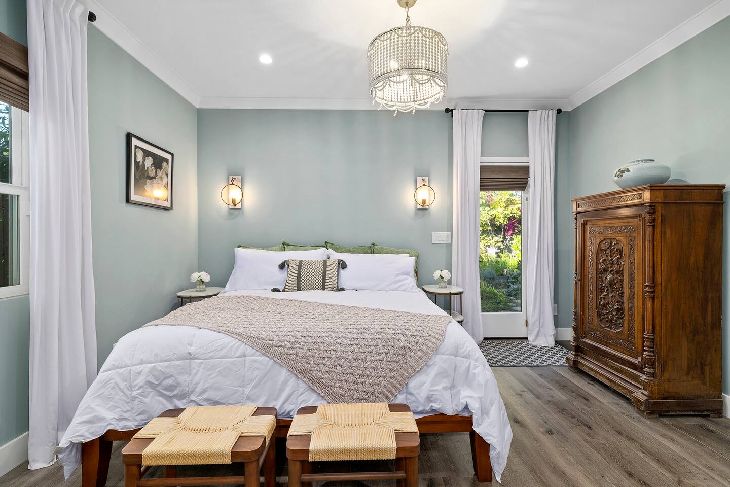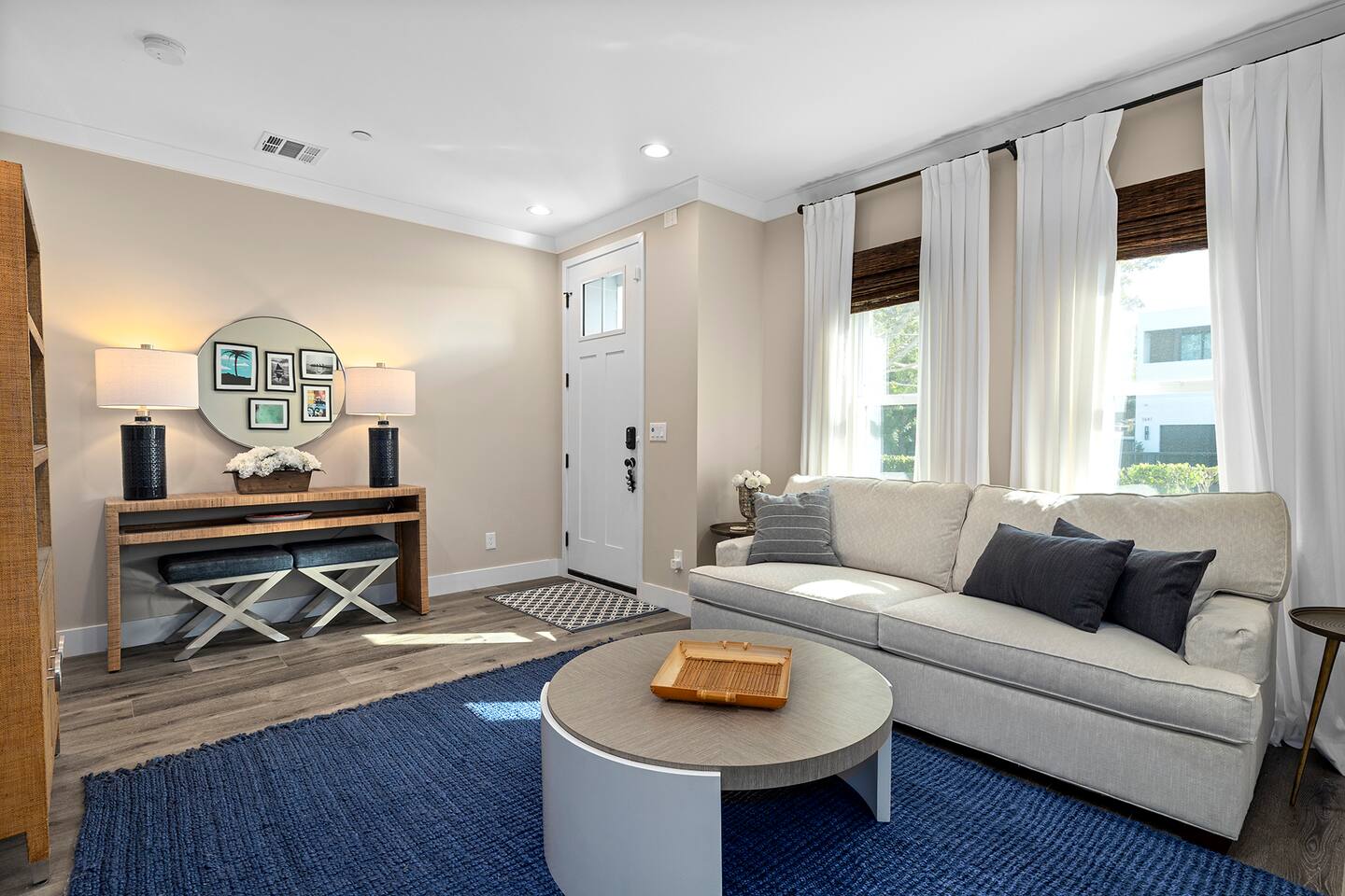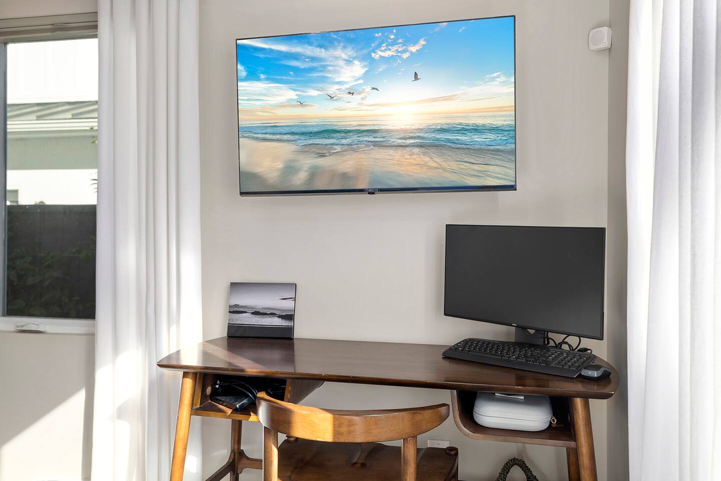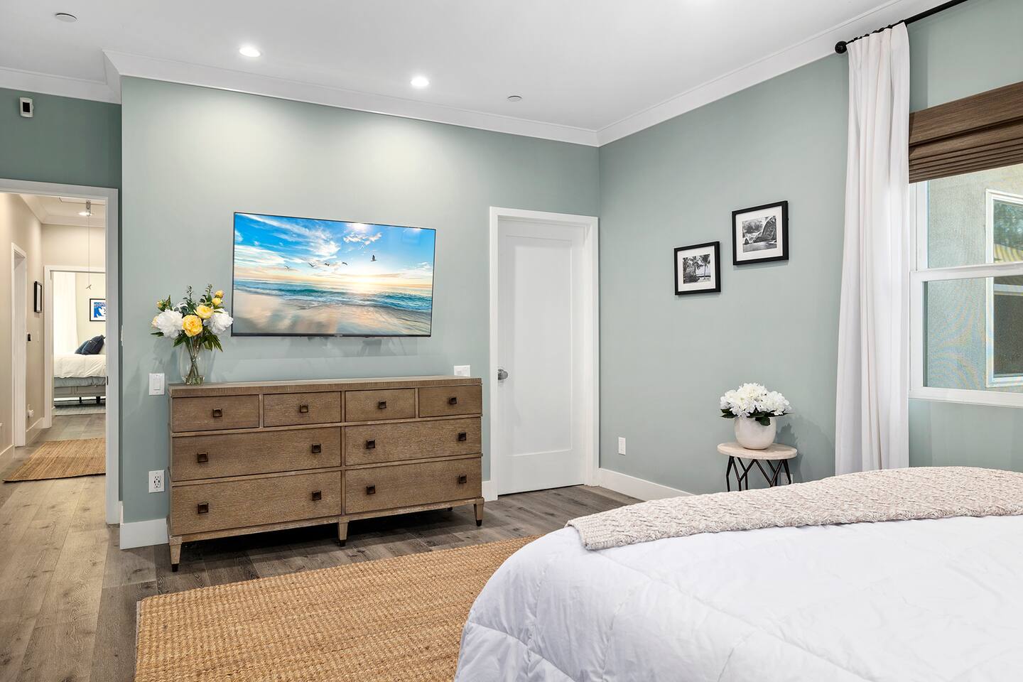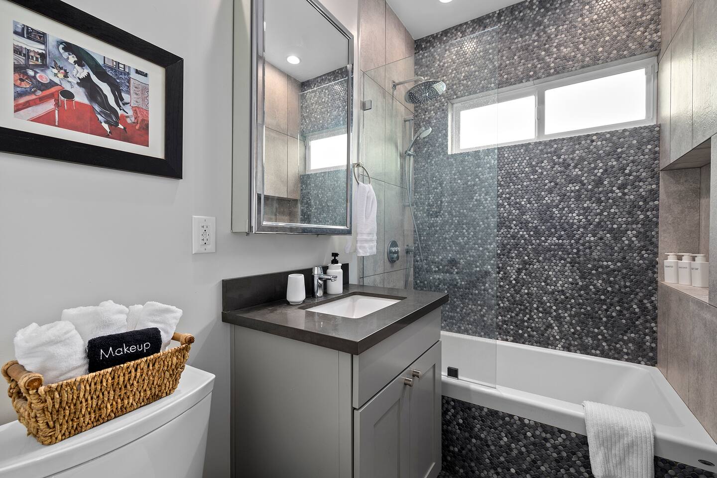 Discover modern living in Mar Vista! This home opens up to a beautiful garden with a heated pool and outdoor kitchen. Inside, relax by the fireplace, watch TV on the 60" flat-screen, or use the high-speed internet. The kitchen has sleek quartz countertops, and the master suite has its own bath and direct pool access. Two additional bedrooms offer comfortable queen beds. A perfect mix of indoor comfort and outdoor fun.