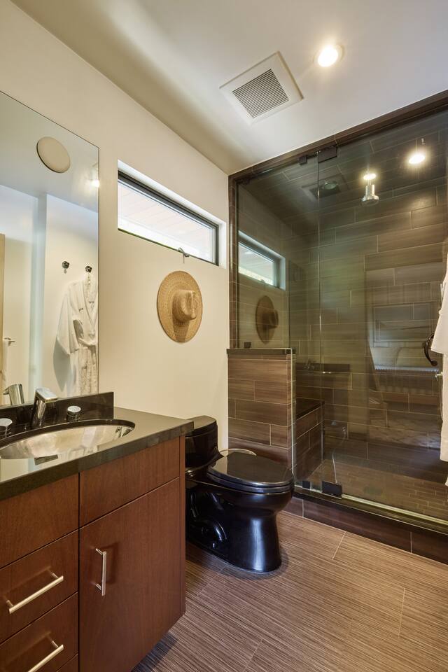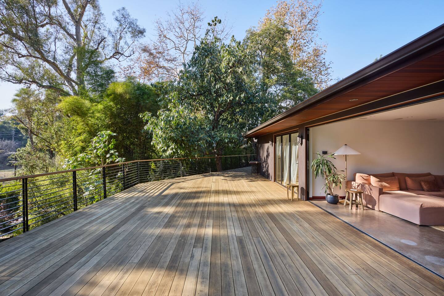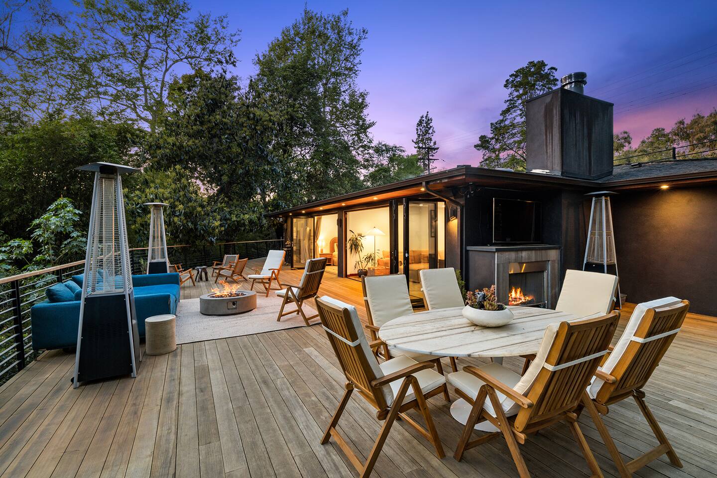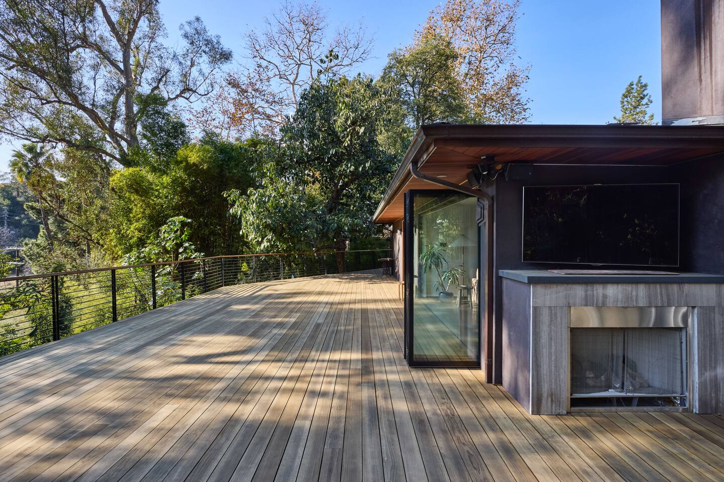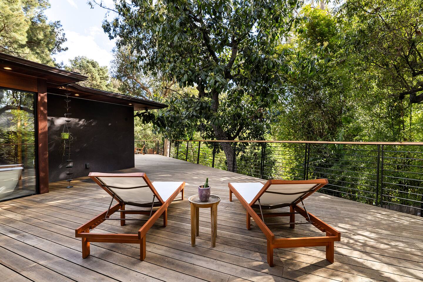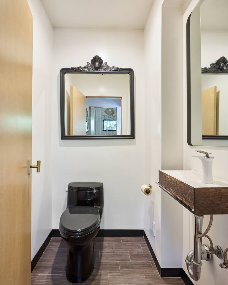 You have full and private use of the unit as shown in the pictures. The property sits in the Hollywood Hills neighborhood of Los Angeles, known for its scenic hillside views, quiet residential streets, and close proximity to popular attractions—about a 10-minute drive to the Hollywood Sign, 15 minutes to Sunset Boulevard, and 20 minutes to West Hollywood. This 2-bedroom, 2.5-bathroom single-family home, built in 1955, spans 1,846 sq. ft. and offers a tranquil retreat with modern amenities and panoramic canyon views, just a 30-minute drive to downtown Los Angeles. **Book for 31 nights or more to avoid city taxes.** - Bedroom 1: King bed, wooden dresser, rustic stool, plush armchair, floor-to-ceiling windows with access to private deck, TV. - Bedroom 2: Queen bed, bean bag chair, boucle armchair, playful alpaca décor, full-length mirror, wooden shelf, large window. - Optional Office/Bedroom: Desk and chair, convertible into sleeping space. - Bathroom 1: Freestanding bathtub, walk-in shower with rainfall head & bench, double vanity with mirror, sliding doors to outdoor deck. - Bathroom 2: Walk-in shower with dual shower heads, granite vanity with sink, modern black toilet, natural light window. - Half Bathroom: Toilet, floating vanity with sink, ornate framed mirror, stylish black & white design. - Living Room: Plush sectional sofa, flat-screen TV, fireplace, piano & guitar, modern artwork, recessed lighting, access to outdoor deck with sofa, chairs, and fire pit. - Kitchen: Fully equipped kitchen, light wood cabinets with marble countertops, stainless steel refrigerator, range & microwave, dining table, kitchen island, open shelving décor, etc. - Outdoor Deck: Blue sectional sofa, wooden chairs, circular dining table with cushioned chairs, outdoor fire pit, built-in fireplace, heat lamps, surrounded by greenery, etc. - Laundry Area: Wood cabinetry with black countertop, stainless steel sink, glass decanters (wet bar setup), plus a pair of stainless steel washing machines. Please note: We provide starter paper products, soap, etc., but as we only host monthly stays, guests will be responsible for replenishing their own consumable products.