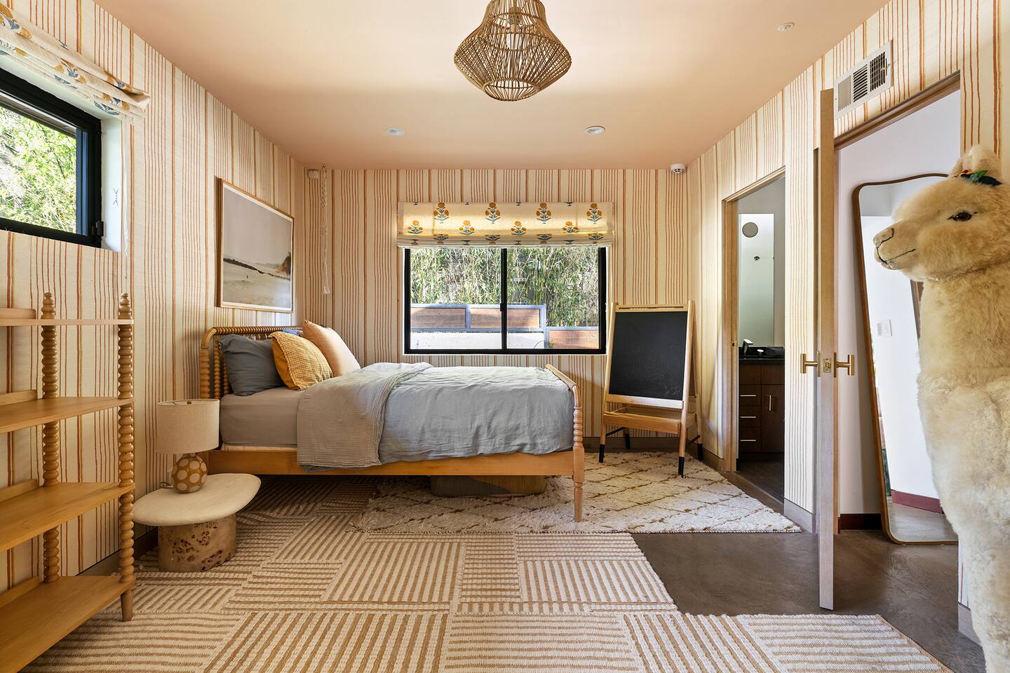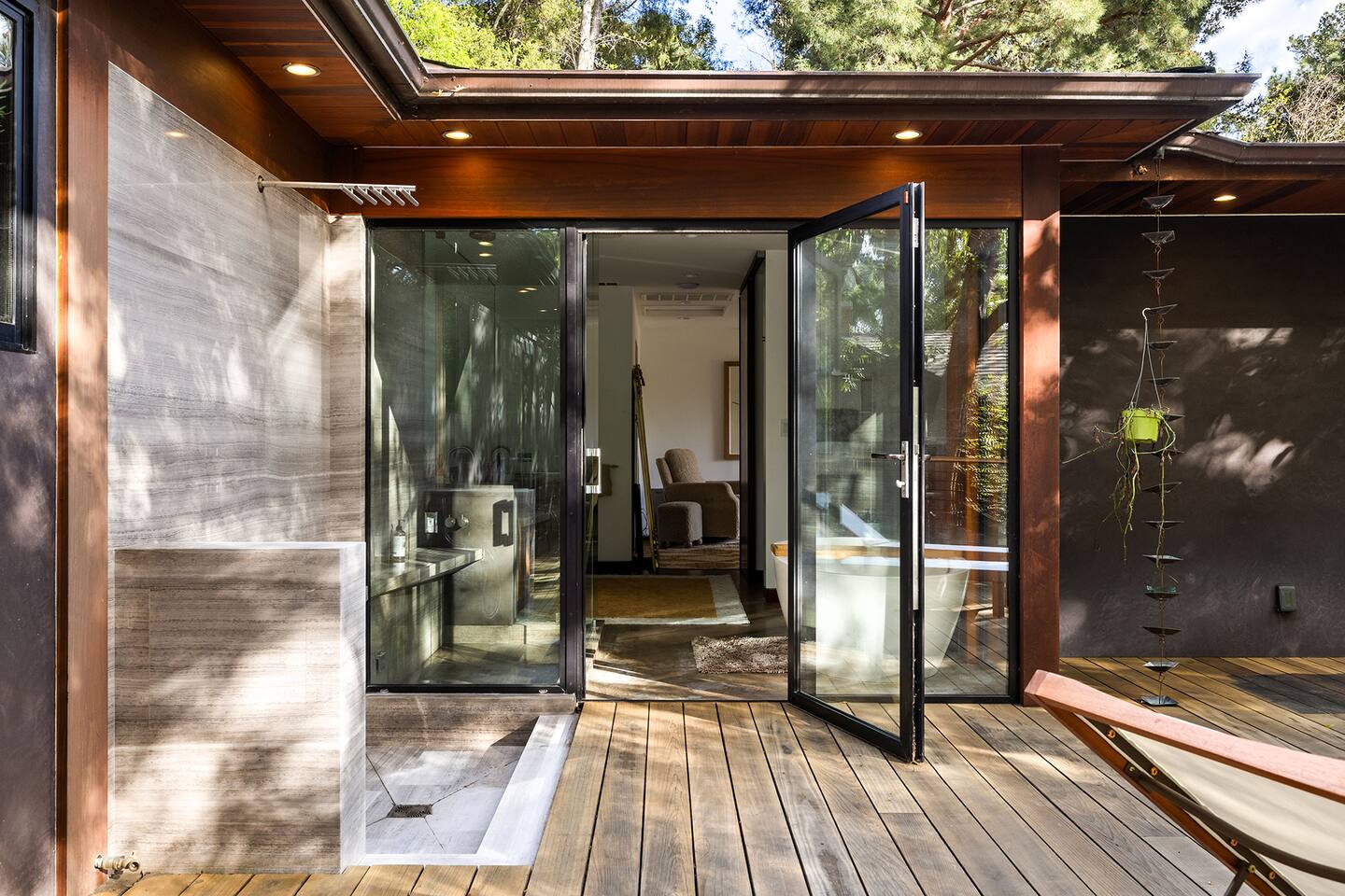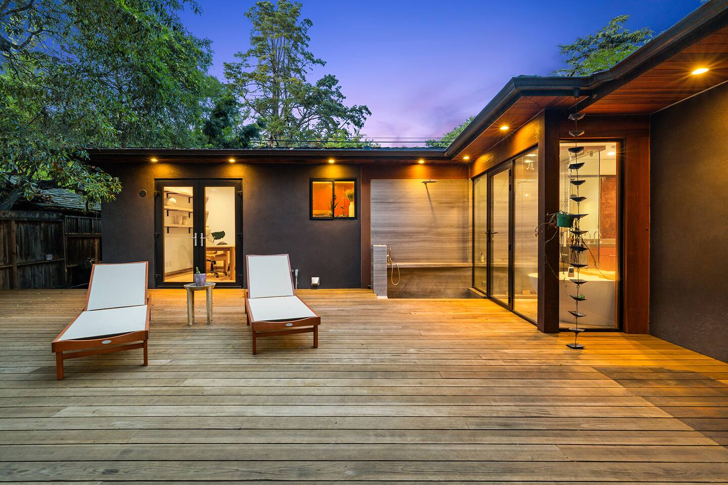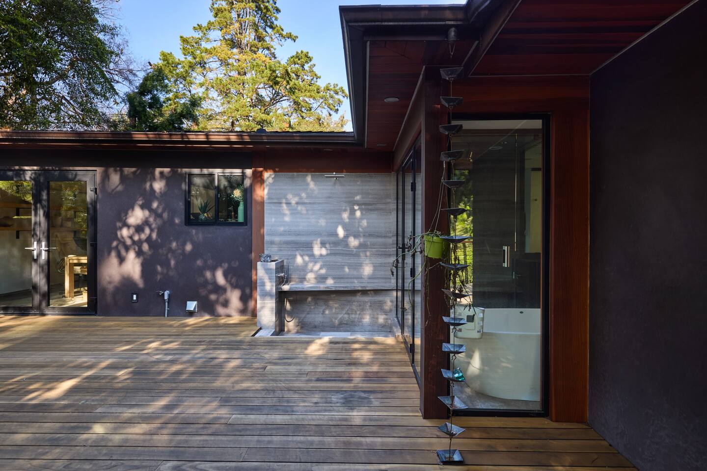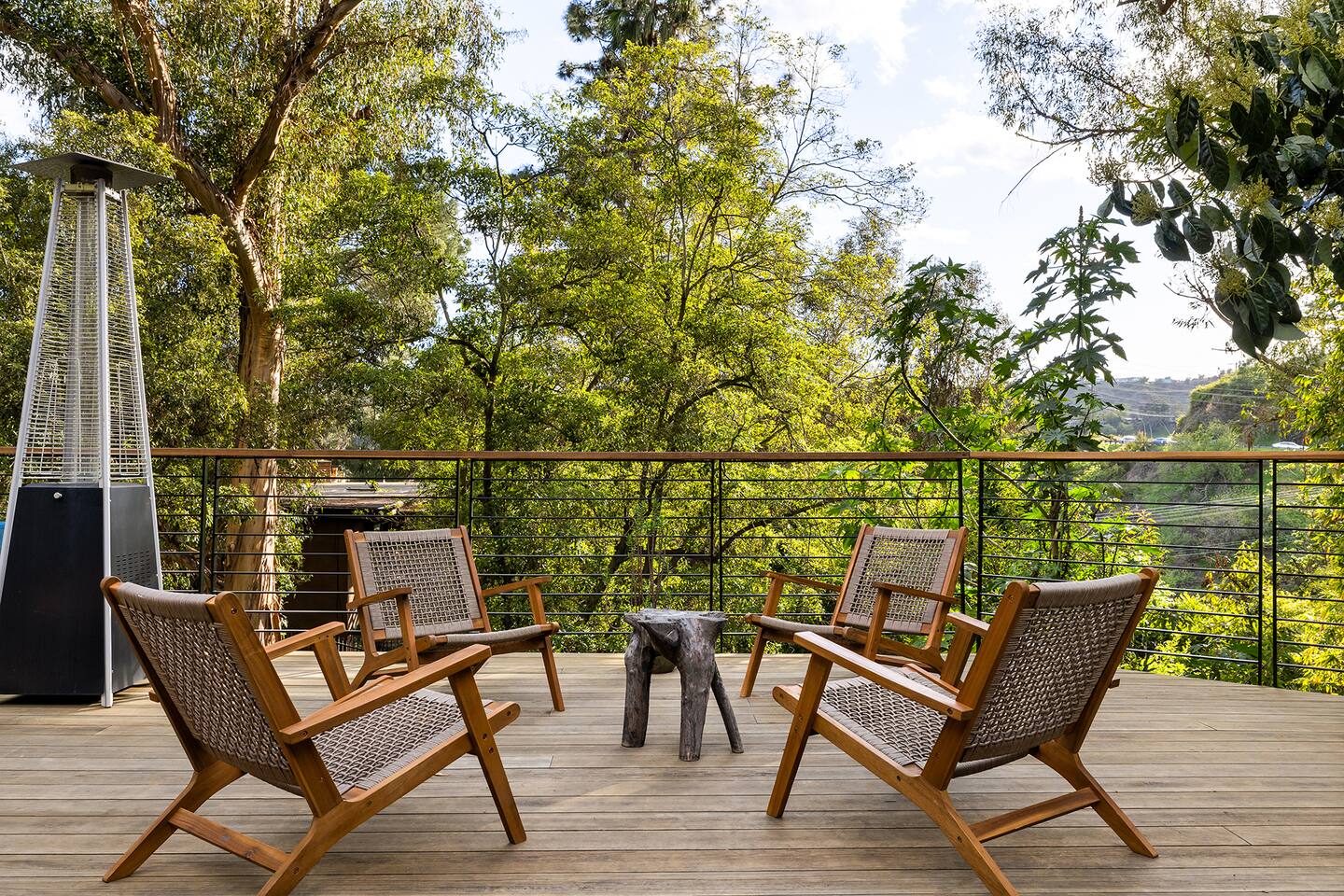 You have full and private use of the unit as shown in the pictures. The property sits in the Hollywood Hills neighborhood of Los Angeles, known for its scenic hillside views, quiet residential streets, and close proximity to popular attractions—about a 10-minute drive to the Hollywood Sign, 15 minutes to Sunset Boulevard, and 20 minutes to West Hollywood. This 2-bedroom, 2.5-bathroom single-family home, built in 1955, spans 1,846 sq. ft. and offers a tranquil retreat with modern amenities and panoramic canyon views, just a 30-minute drive to downtown Los Angeles. **Book for 31 nights or more to avoid city taxes.** - Bedroom 1: King bed, wooden dresser, rustic stool, plush armchair, floor-to-ceiling windows with access to private deck, TV. - Bedroom 2: Queen bed, bean bag chair, boucle armchair, playful alpaca décor, full-length mirror, wooden shelf, large window. - Optional Office/Bedroom: Desk and chair, convertible into sleeping space. - Bathroom 1: Freestanding bathtub, walk-in shower with rainfall head & bench, double vanity with mirror, sliding doors to outdoor deck. - Bathroom 2: Walk-in shower with dual shower heads, granite vanity with sink, modern black toilet, natural light window. - Half Bathroom: Toilet, floating vanity with sink, ornate framed mirror, stylish black & white design. - Living Room: Plush sectional sofa, flat-screen TV, fireplace, piano & guitar, modern artwork, recessed lighting, access to outdoor deck with sofa, chairs, and fire pit. - Kitchen: Fully equipped kitchen, light wood cabinets with marble countertops, stainless steel refrigerator, range & microwave, dining table, kitchen island, open shelving décor, etc. - Outdoor Deck: Blue sectional sofa, wooden chairs, circular dining table with cushioned chairs, outdoor fire pit, built-in fireplace, heat lamps, surrounded by greenery, etc. - Laundry Area: Wood cabinetry with black countertop, stainless steel sink, glass decanters (wet bar setup), plus a pair of stainless steel washing machines. Please note: We provide starter paper products, soap, etc., but as we only host monthly stays, guests will be responsible for replenishing their own consumable products.