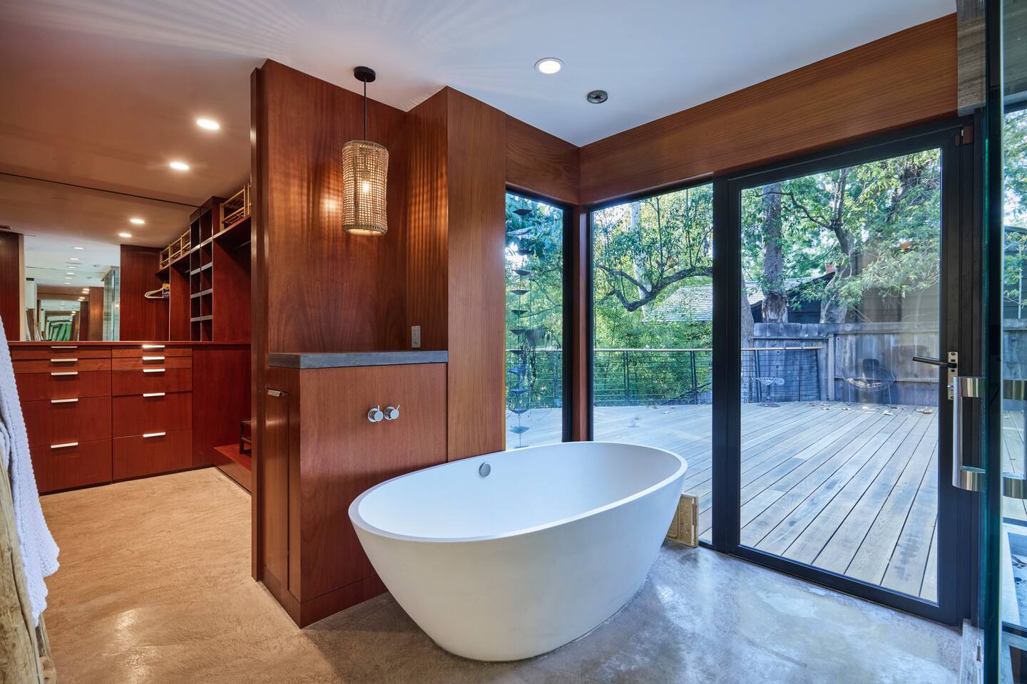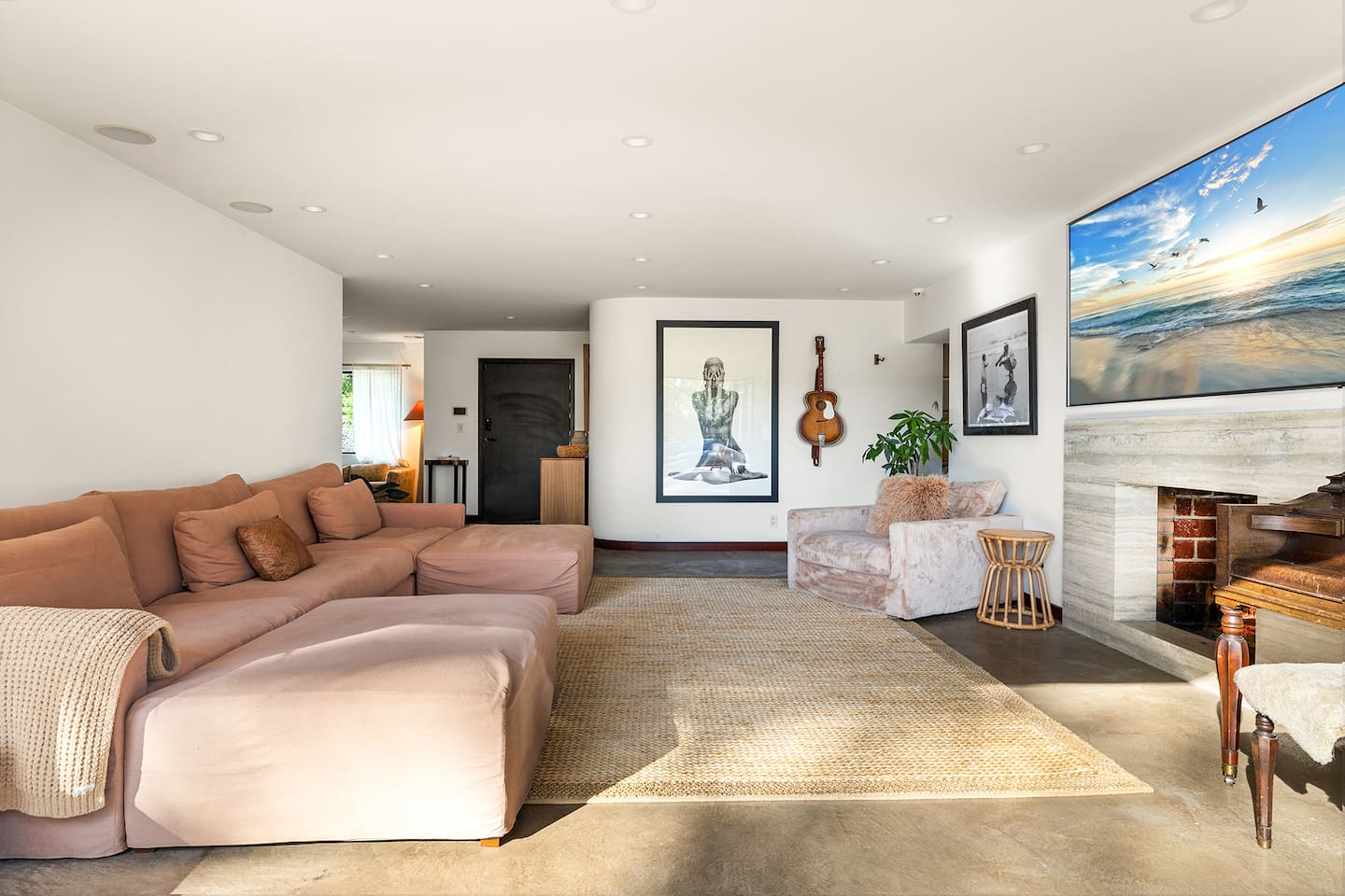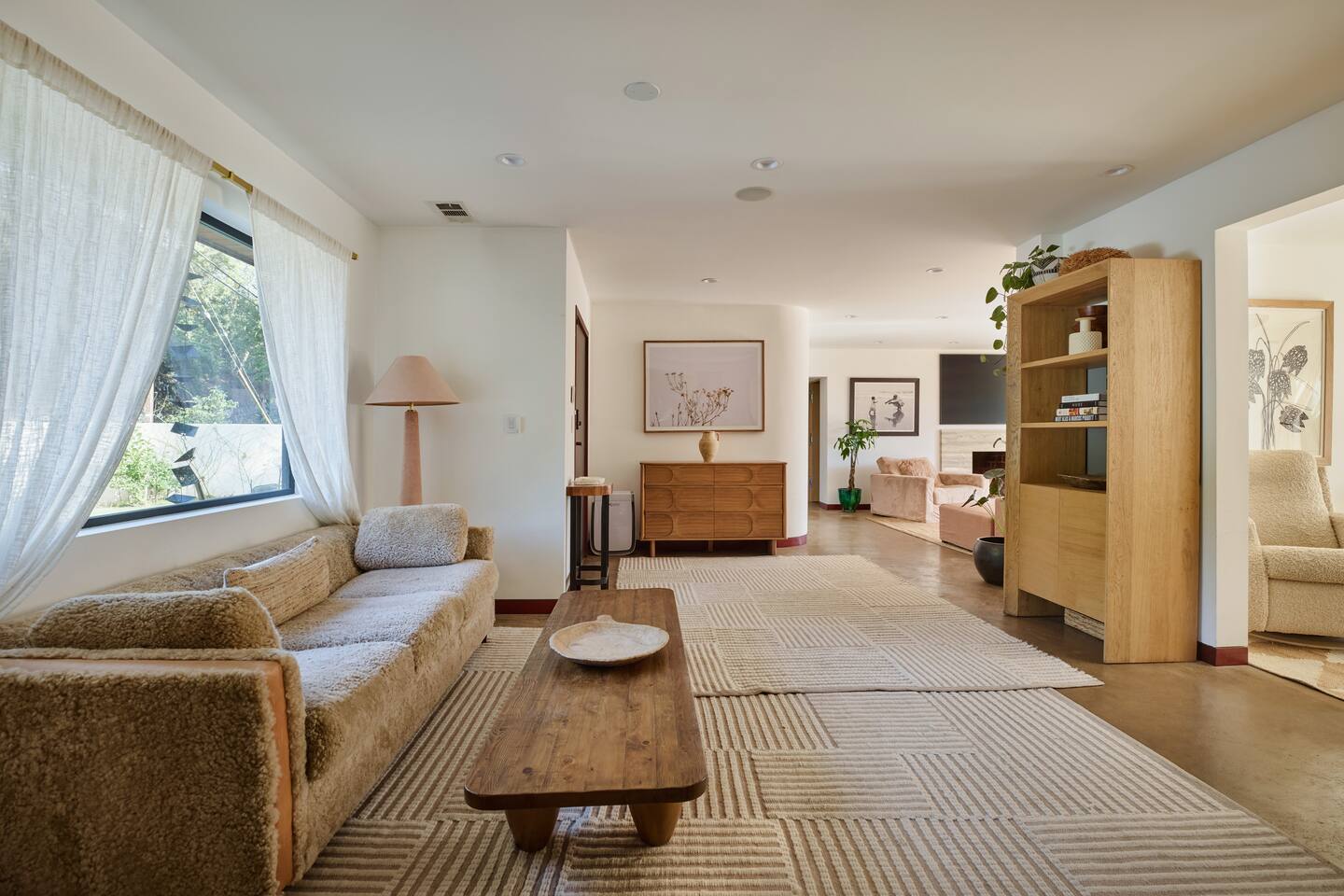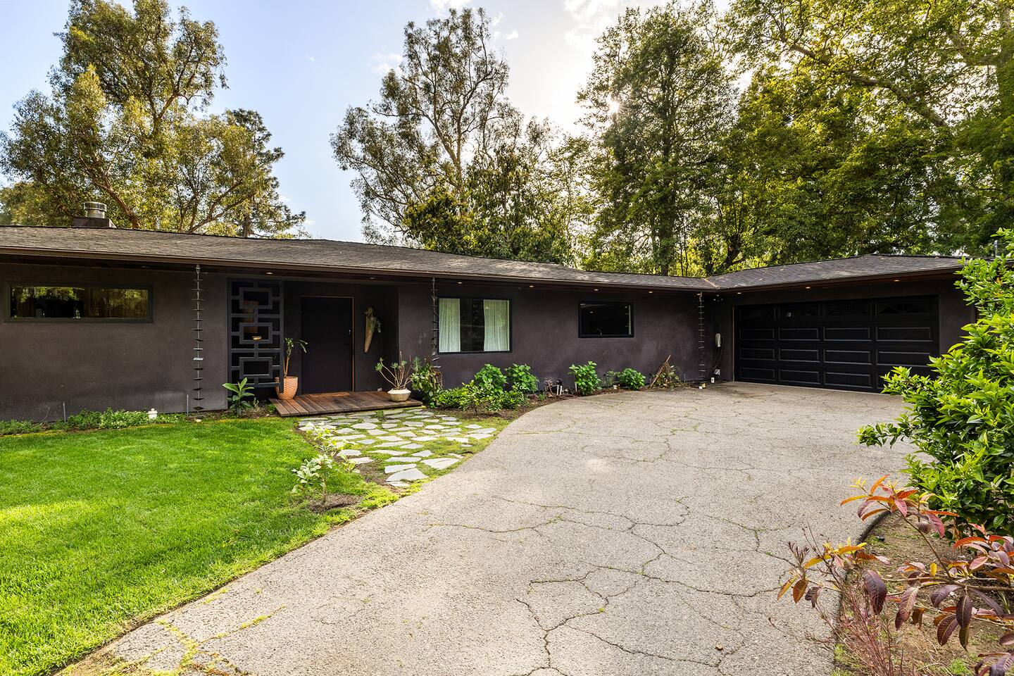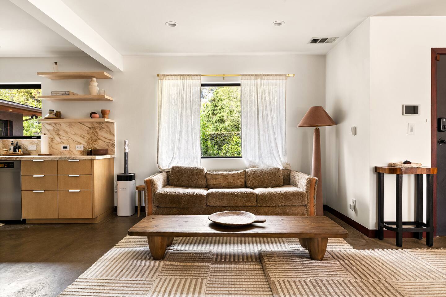 You have full and private use of the unit as shown in the pictures. The property sits in the Hollywood Hills neighborhood of Los Angeles, known for its scenic hillside views, quiet residential streets, and close proximity to popular attractions—about a 10-minute drive to the Hollywood Sign, 15 minutes to Sunset Boulevard, and 20 minutes to West Hollywood. This 2-bedroom, 2.5-bathroom single-family home, built in 1955, spans 1,846 sq. ft. and offers a tranquil retreat with modern amenities and panoramic canyon views, just a 30-minute drive to downtown Los Angeles. **Book for 31 nights or more to avoid city taxes.** - Bedroom 1: King bed, wooden dresser, rustic stool, plush armchair, floor-to-ceiling windows with access to private deck, TV. - Bedroom 2: Queen bed, bean bag chair, boucle armchair, playful alpaca décor, full-length mirror, wooden shelf, large window. - Optional Office/Bedroom: Desk and chair, convertible into sleeping space. - Bathroom 1: Freestanding bathtub, walk-in shower with rainfall head & bench, double vanity with mirror, sliding doors to outdoor deck. - Bathroom 2: Walk-in shower with dual shower heads, granite vanity with sink, modern black toilet, natural light window. - Half Bathroom: Toilet, floating vanity with sink, ornate framed mirror, stylish black & white design. - Living Room: Plush sectional sofa, flat-screen TV, fireplace, piano & guitar, modern artwork, recessed lighting, access to outdoor deck with sofa, chairs, and fire pit. - Kitchen: Fully equipped kitchen, light wood cabinets with marble countertops, stainless steel refrigerator, range & microwave, dining table, kitchen island, open shelving décor, etc. - Outdoor Deck: Blue sectional sofa, wooden chairs, circular dining table with cushioned chairs, outdoor fire pit, built-in fireplace, heat lamps, surrounded by greenery, etc. - Laundry Area: Wood cabinetry with black countertop, stainless steel sink, glass decanters (wet bar setup), plus a pair of stainless steel washing machines. Please note: We provide starter paper products, soap, etc., but as we only host monthly stays, guests will be responsible for replenishing their own consumable products.