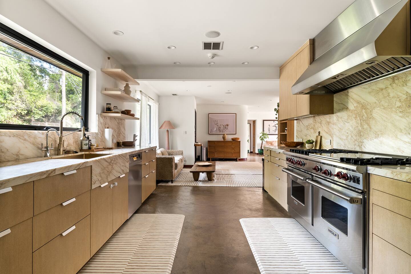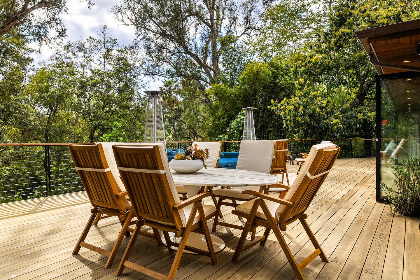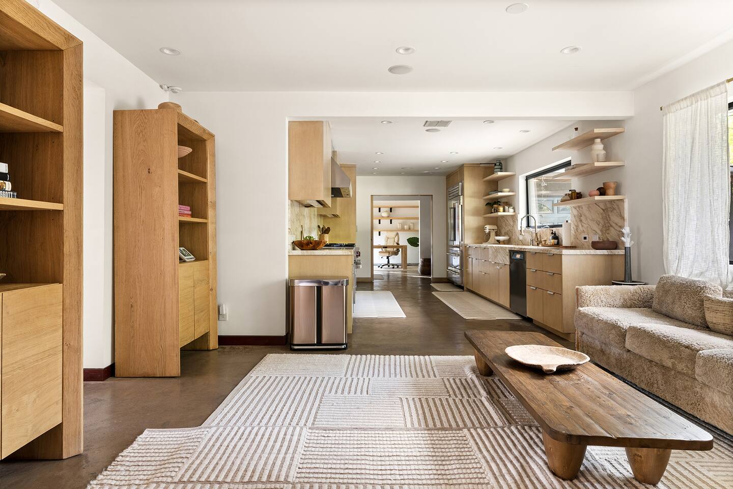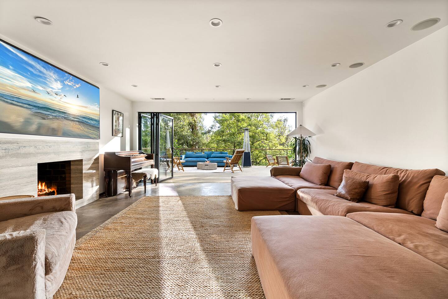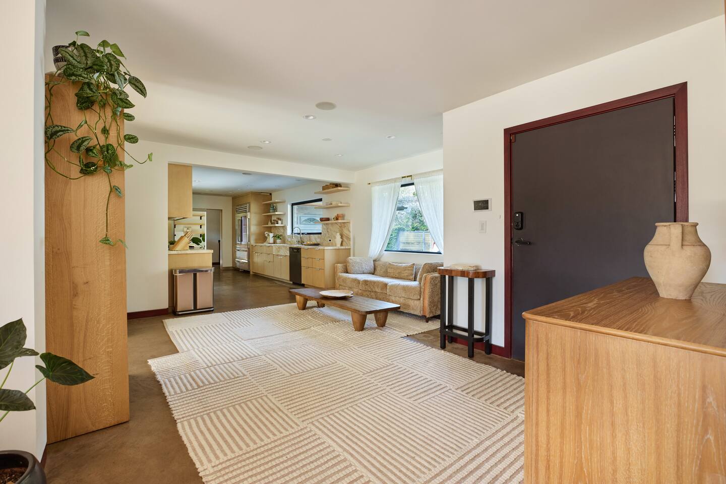 You have full and private use of the unit as shown in the pictures. The property sits in the Hollywood Hills neighborhood of Los Angeles, known for its scenic hillside views, quiet residential streets, and close proximity to popular attractions—about a 10-minute drive to the Hollywood Sign, 15 minutes to Sunset Boulevard, and 20 minutes to West Hollywood. This 2-bedroom, 2.5-bathroom single-family home, built in 1955, spans 1,846 sq. ft. and offers a tranquil retreat with modern amenities and panoramic canyon views, just a 30-minute drive to downtown Los Angeles. **Book for 31 nights or more to avoid city taxes.** - Bedroom 1: King bed, wooden dresser, rustic stool, plush armchair, floor-to-ceiling windows with access to private deck, TV. - Bedroom 2: Queen bed, bean bag chair, boucle armchair, playful alpaca décor, full-length mirror, wooden shelf, large window. - Optional Office/Bedroom: Desk and chair, convertible into sleeping space. - Bathroom 1: Freestanding bathtub, walk-in shower with rainfall head & bench, double vanity with mirror, sliding doors to outdoor deck. - Bathroom 2: Walk-in shower with dual shower heads, granite vanity with sink, modern black toilet, natural light window. - Half Bathroom: Toilet, floating vanity with sink, ornate framed mirror, stylish black & white design. - Living Room: Plush sectional sofa, flat-screen TV, fireplace, piano & guitar, modern artwork, recessed lighting, access to outdoor deck with sofa, chairs, and fire pit. - Kitchen: Fully equipped kitchen, light wood cabinets with marble countertops, stainless steel refrigerator, range & microwave, dining table, kitchen island, open shelving décor, etc. - Outdoor Deck: Blue sectional sofa, wooden chairs, circular dining table with cushioned chairs, outdoor fire pit, built-in fireplace, heat lamps, surrounded by greenery, etc. - Laundry Area: Wood cabinetry with black countertop, stainless steel sink, glass decanters (wet bar setup), plus a pair of stainless steel washing machines. Please note: We provide starter paper products, soap, etc., but as we only host monthly stays, guests will be responsible for replenishing their own consumable products.