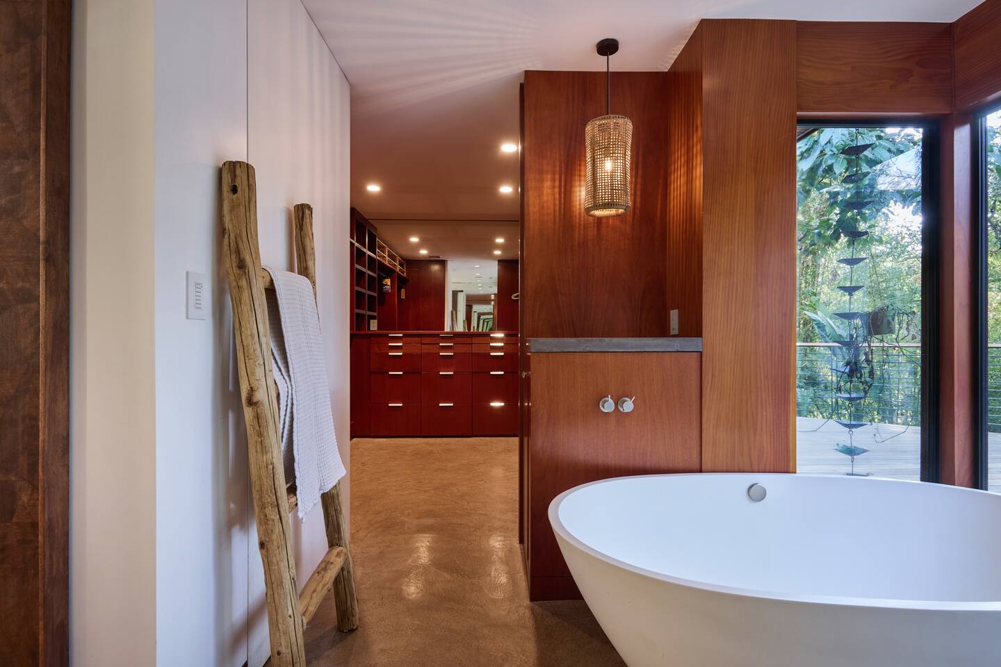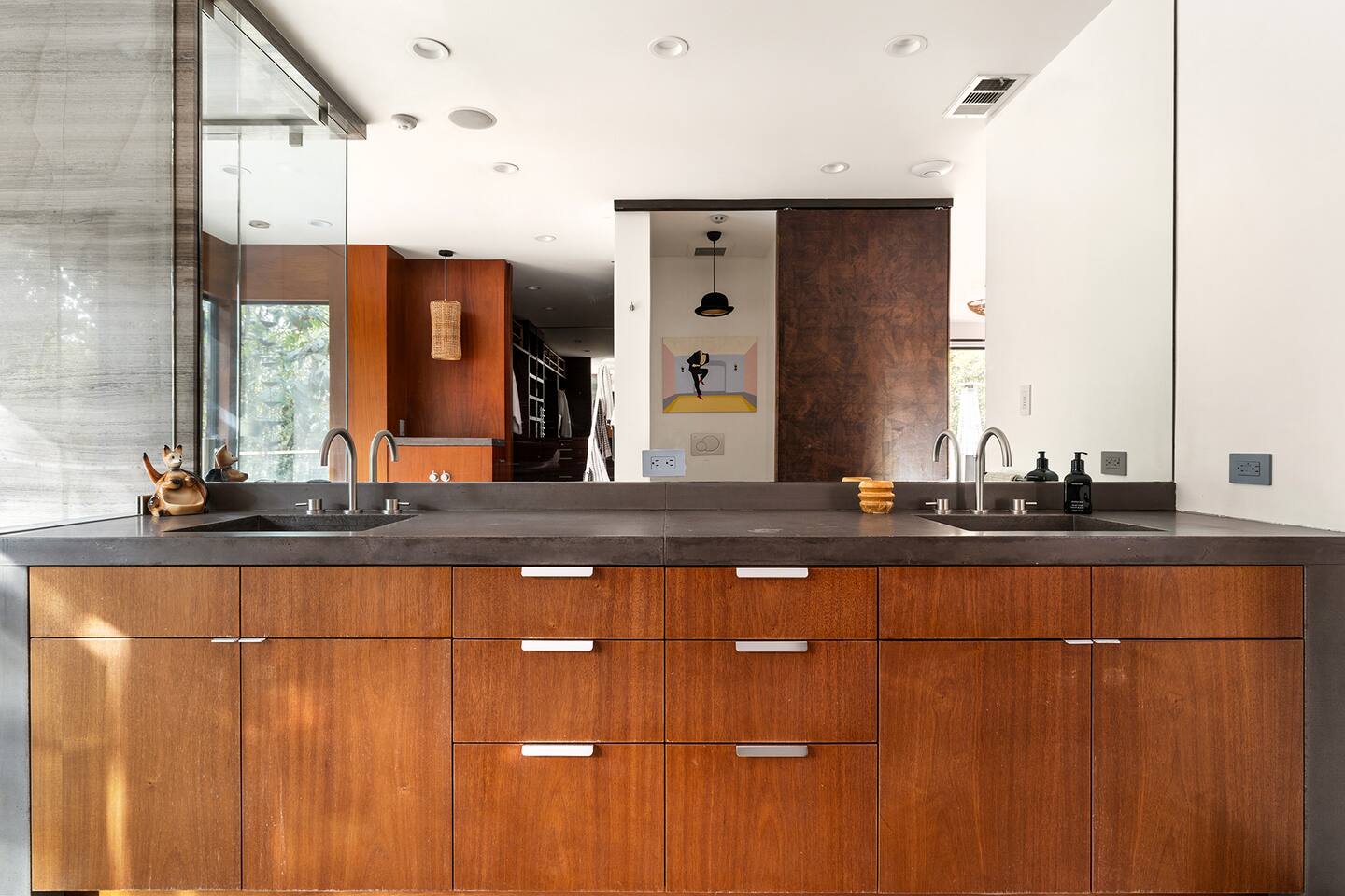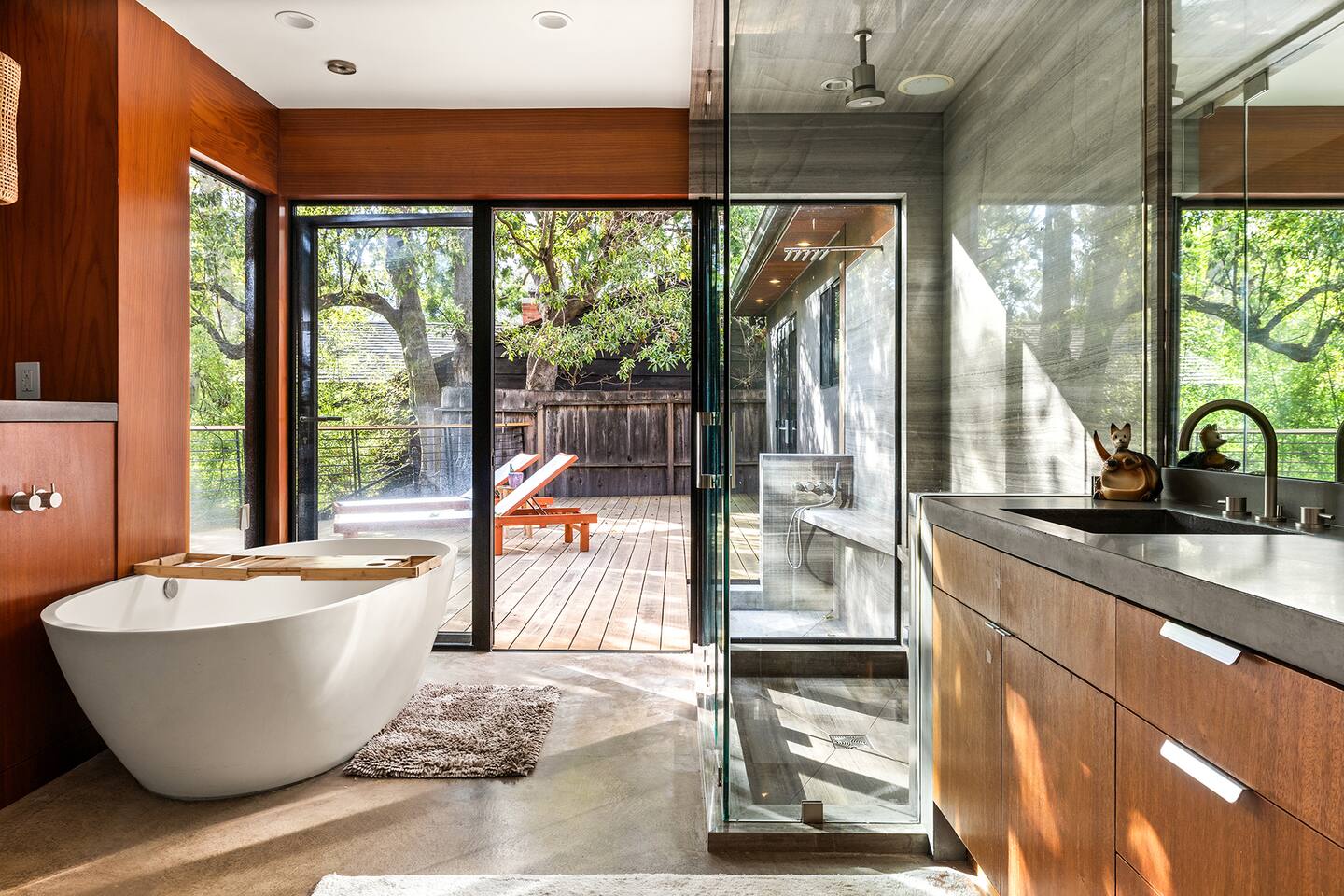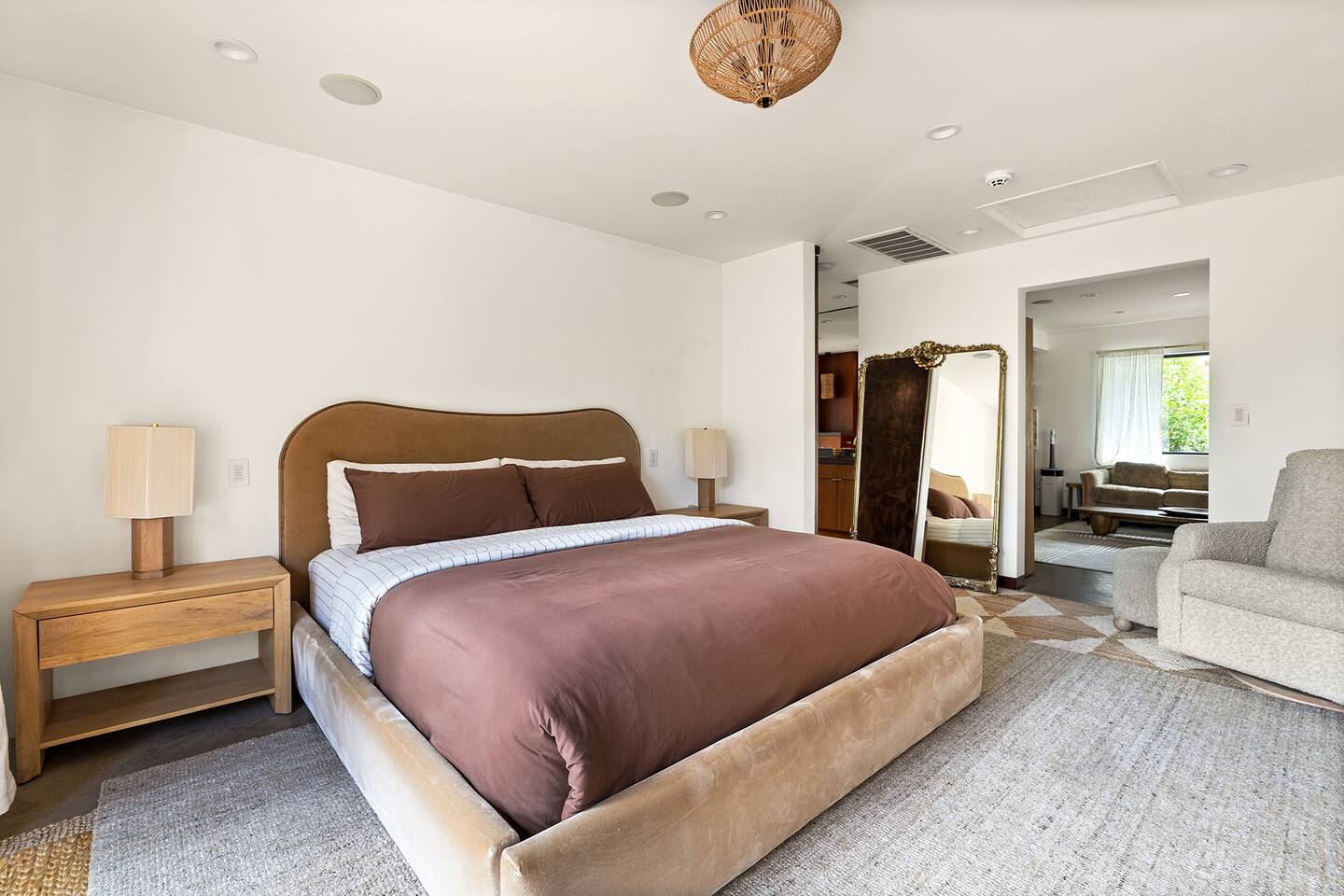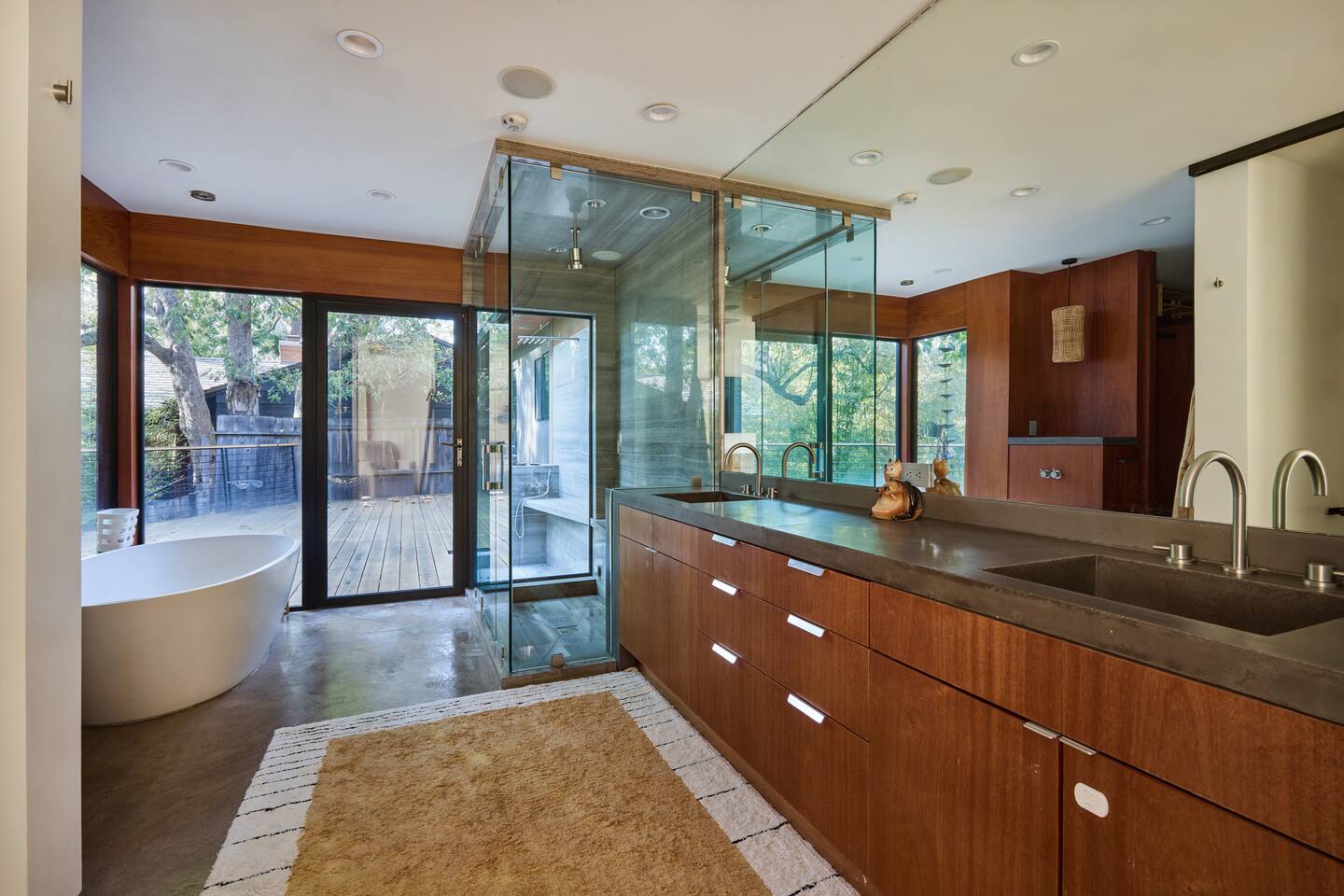 You have full and private use of the unit as shown in the pictures. The property sits in the Hollywood Hills neighborhood of Los Angeles, known for its scenic hillside views, quiet residential streets, and close proximity to popular attractions—about a 10-minute drive to the Hollywood Sign, 15 minutes to Sunset Boulevard, and 20 minutes to West Hollywood. This 2-bedroom, 2.5-bathroom single-family home, built in 1955, spans 1,846 sq. ft. and offers a tranquil retreat with modern amenities and panoramic canyon views, just a 30-minute drive to downtown Los Angeles. **Book for 31 nights or more to avoid city taxes.** - Bedroom 1: King bed, wooden dresser, rustic stool, plush armchair, floor-to-ceiling windows with access to private deck, TV. - Bedroom 2: Queen bed, bean bag chair, boucle armchair, playful alpaca décor, full-length mirror, wooden shelf, large window. - Optional Office/Bedroom: Desk and chair, convertible into sleeping space. - Bathroom 1: Freestanding bathtub, walk-in shower with rainfall head & bench, double vanity with mirror, sliding doors to outdoor deck. - Bathroom 2: Walk-in shower with dual shower heads, granite vanity with sink, modern black toilet, natural light window. - Half Bathroom: Toilet, floating vanity with sink, ornate framed mirror, stylish black & white design. - Living Room: Plush sectional sofa, flat-screen TV, fireplace, piano & guitar, modern artwork, recessed lighting, access to outdoor deck with sofa, chairs, and fire pit. - Kitchen: Fully equipped kitchen, light wood cabinets with marble countertops, stainless steel refrigerator, range & microwave, dining table, kitchen island, open shelving décor, etc. - Outdoor Deck: Blue sectional sofa, wooden chairs, circular dining table with cushioned chairs, outdoor fire pit, built-in fireplace, heat lamps, surrounded by greenery, etc. - Laundry Area: Wood cabinetry with black countertop, stainless steel sink, glass decanters (wet bar setup), plus a pair of stainless steel washing machines. Please note: We provide starter paper products, soap, etc., but as we only host monthly stays, guests will be responsible for replenishing their own consumable products.