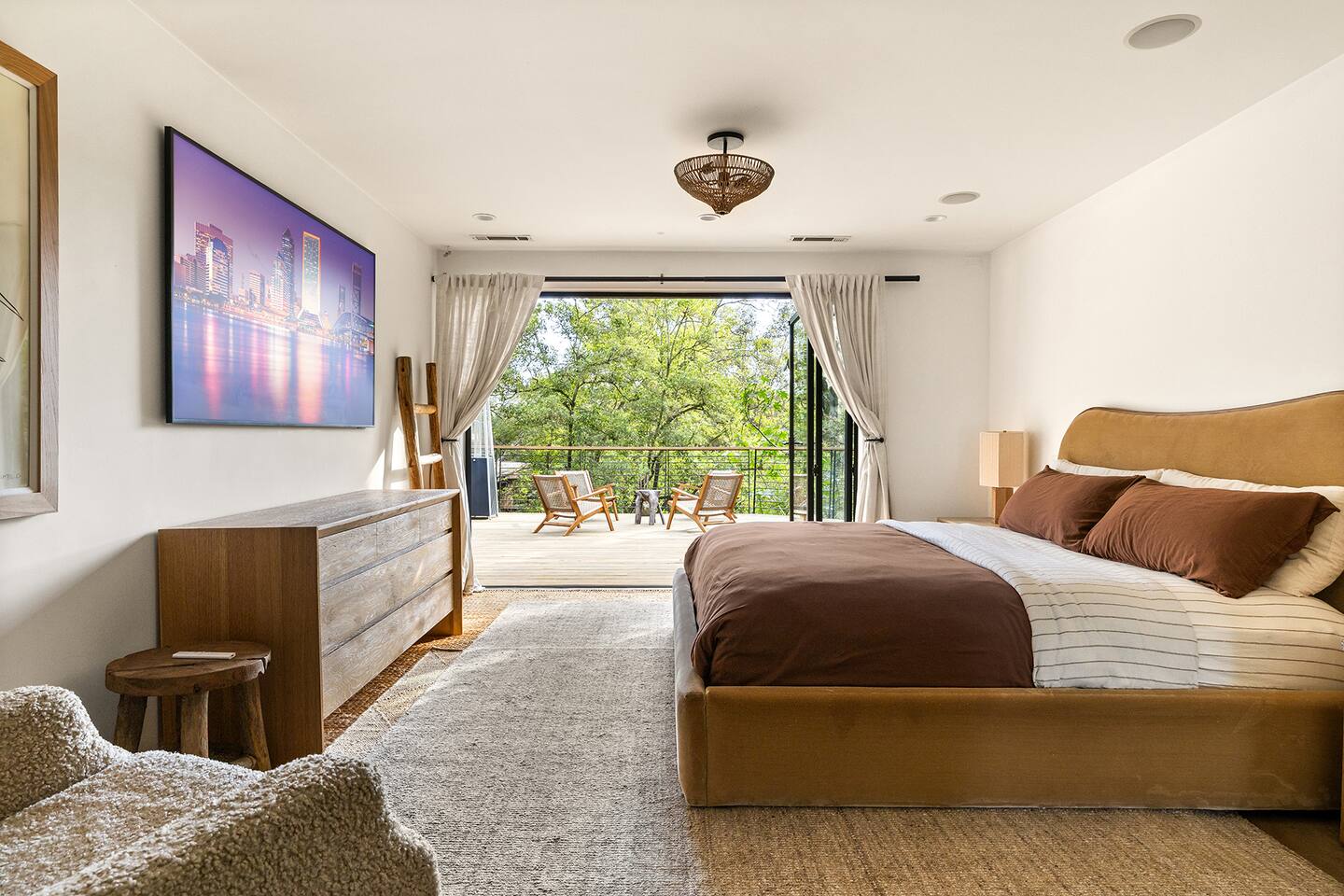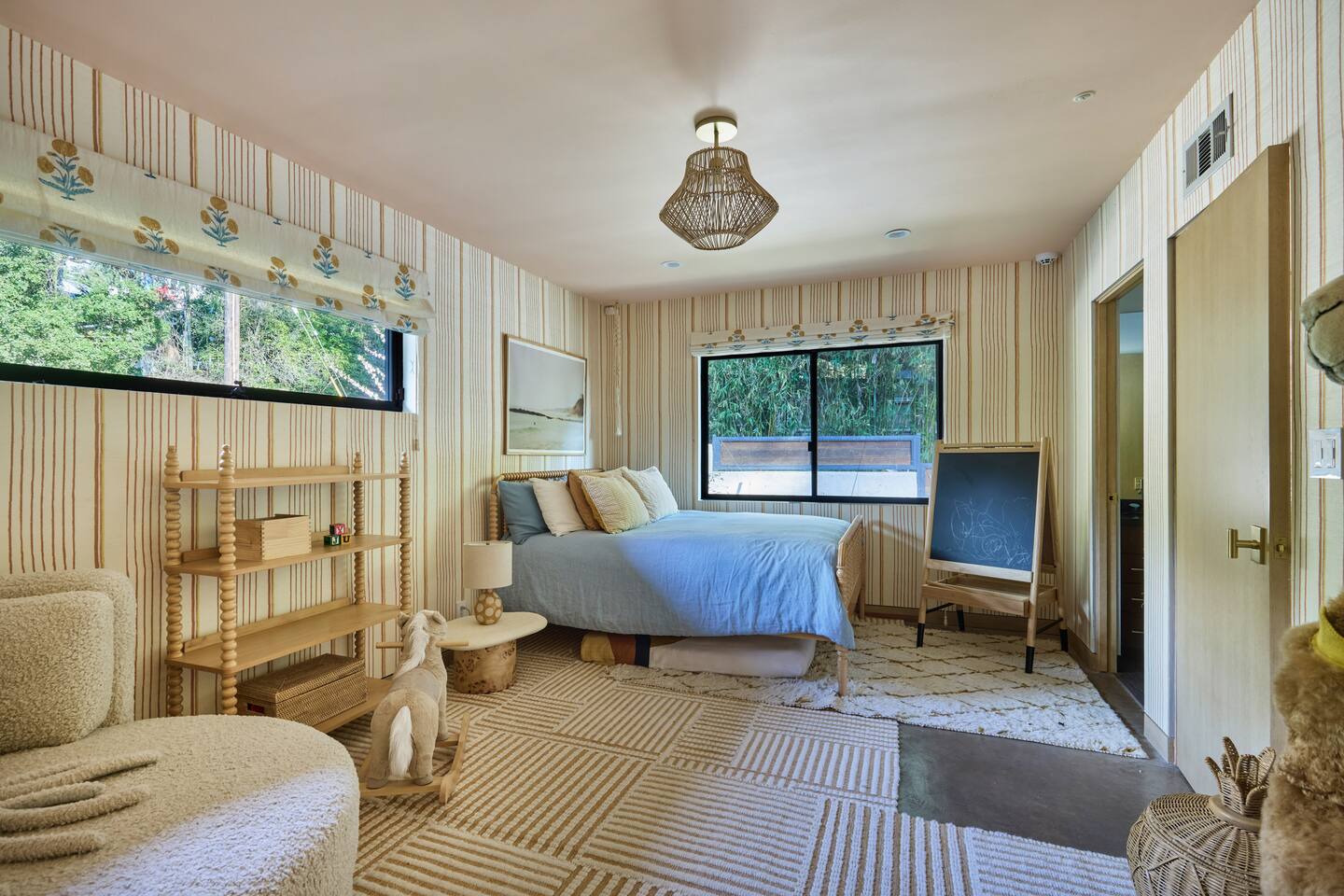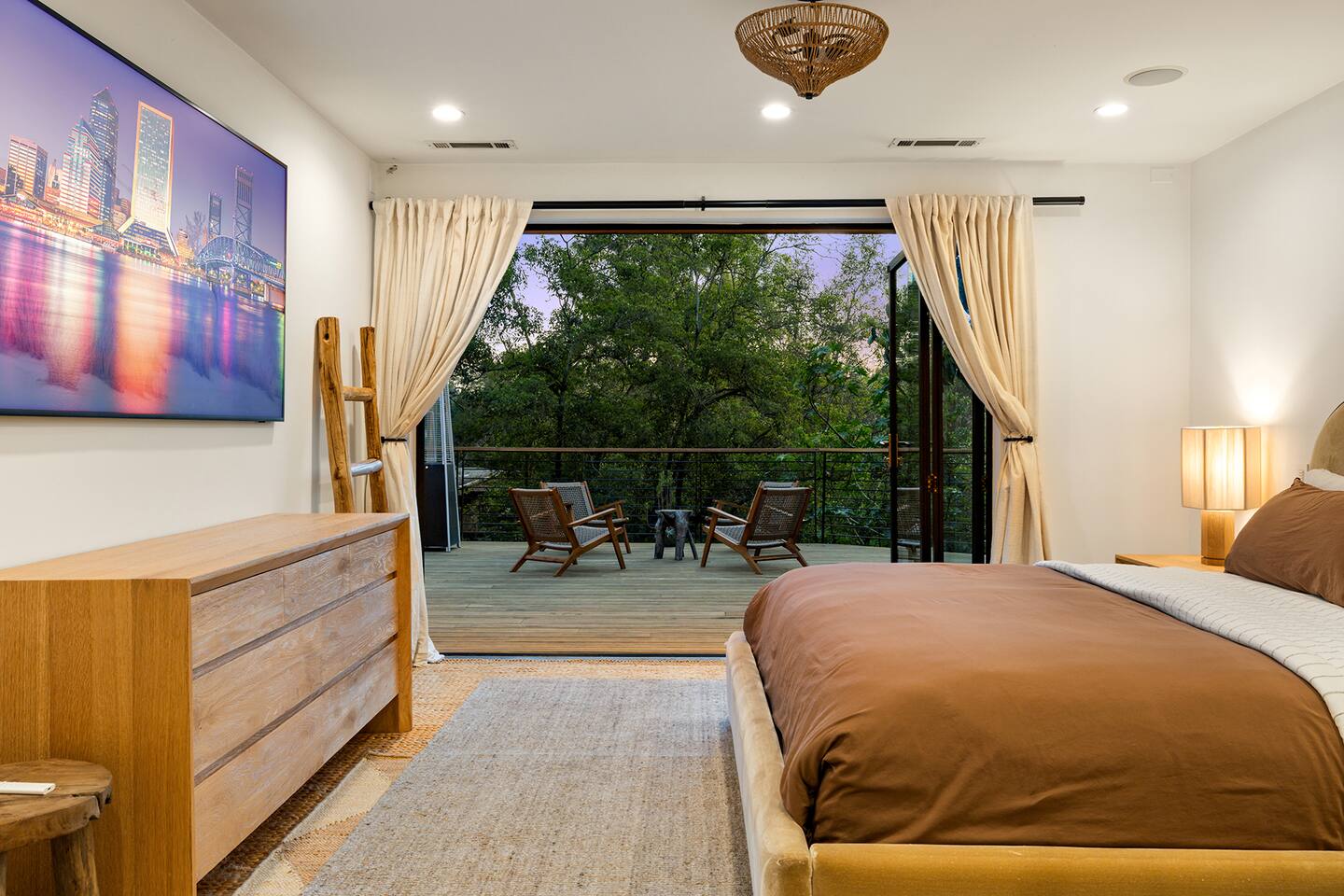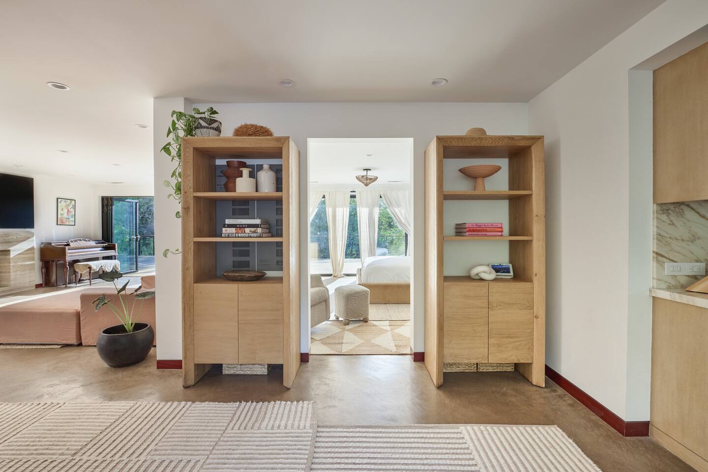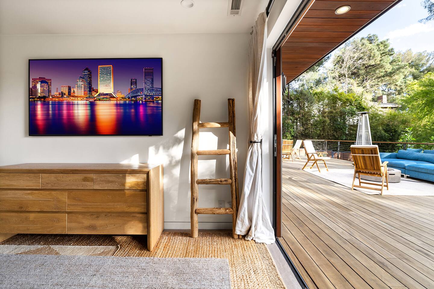 You have full and private use of the unit as shown in the pictures. The property sits in the Hollywood Hills neighborhood of Los Angeles, known for its scenic hillside views, quiet residential streets, and close proximity to popular attractions—about a 10-minute drive to the Hollywood Sign, 15 minutes to Sunset Boulevard, and 20 minutes to West Hollywood. This 2-bedroom, 2.5-bathroom single-family home, built in 1955, spans 1,846 sq. ft. and offers a tranquil retreat with modern amenities and panoramic canyon views, just a 30-minute drive to downtown Los Angeles. **Book for 31 nights or more to avoid city taxes.** - Bedroom 1: King bed, wooden dresser, rustic stool, plush armchair, floor-to-ceiling windows with access to private deck, TV. - Bedroom 2: Queen bed, bean bag chair, boucle armchair, playful alpaca décor, full-length mirror, wooden shelf, large window. - Optional Office/Bedroom: Desk and chair, convertible into sleeping space. - Bathroom 1: Freestanding bathtub, walk-in shower with rainfall head & bench, double vanity with mirror, sliding doors to outdoor deck. - Bathroom 2: Walk-in shower with dual shower heads, granite vanity with sink, modern black toilet, natural light window. - Half Bathroom: Toilet, floating vanity with sink, ornate framed mirror, stylish black & white design. - Living Room: Plush sectional sofa, flat-screen TV, fireplace, piano & guitar, modern artwork, recessed lighting, access to outdoor deck with sofa, chairs, and fire pit. - Kitchen: Fully equipped kitchen, light wood cabinets with marble countertops, stainless steel refrigerator, range & microwave, dining table, kitchen island, open shelving décor, etc. - Outdoor Deck: Blue sectional sofa, wooden chairs, circular dining table with cushioned chairs, outdoor fire pit, built-in fireplace, heat lamps, surrounded by greenery, etc. - Laundry Area: Wood cabinetry with black countertop, stainless steel sink, glass decanters (wet bar setup), plus a pair of stainless steel washing machines. Please note: We provide starter paper products, soap, etc., but as we only host monthly stays, guests will be responsible for replenishing their own consumable products.