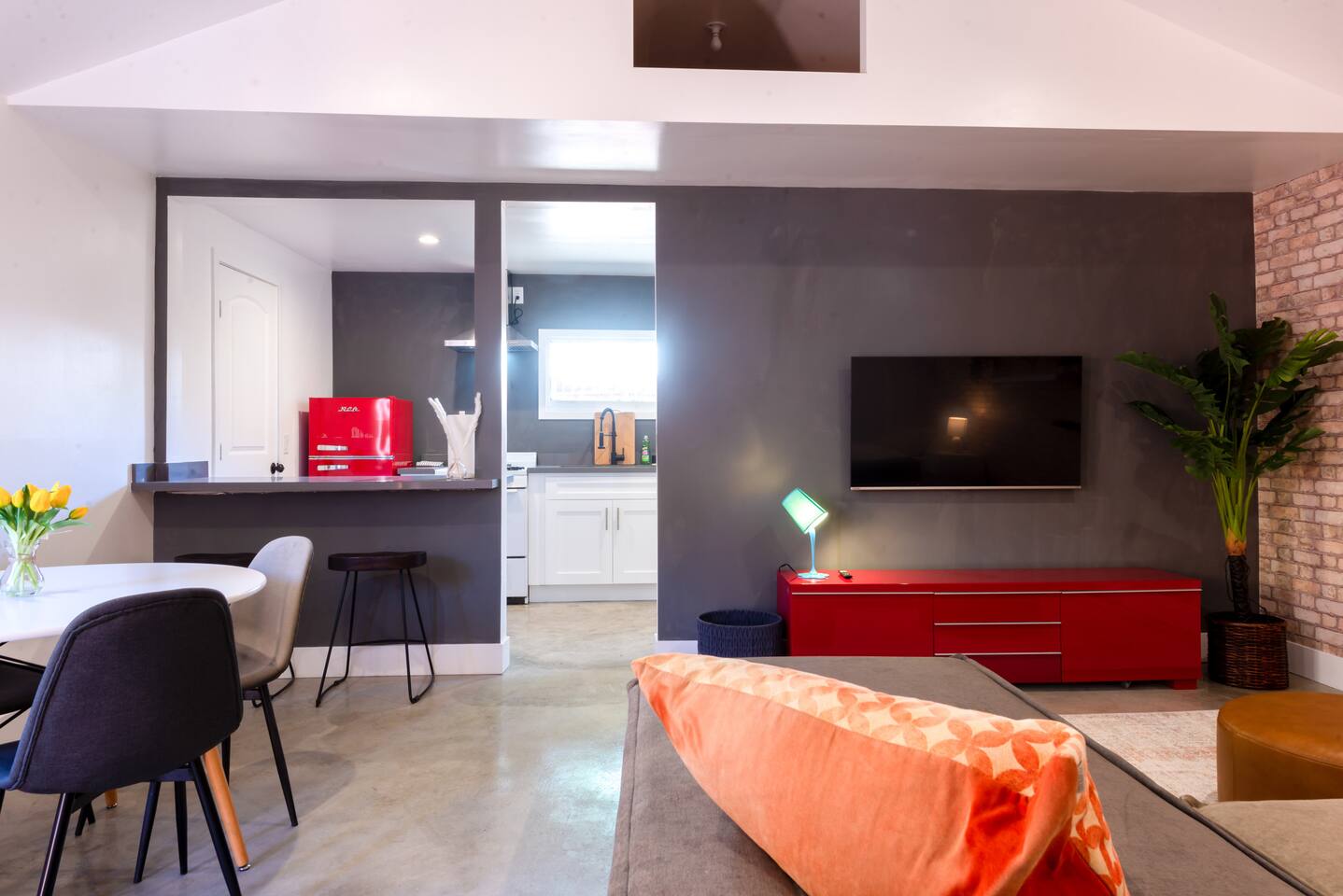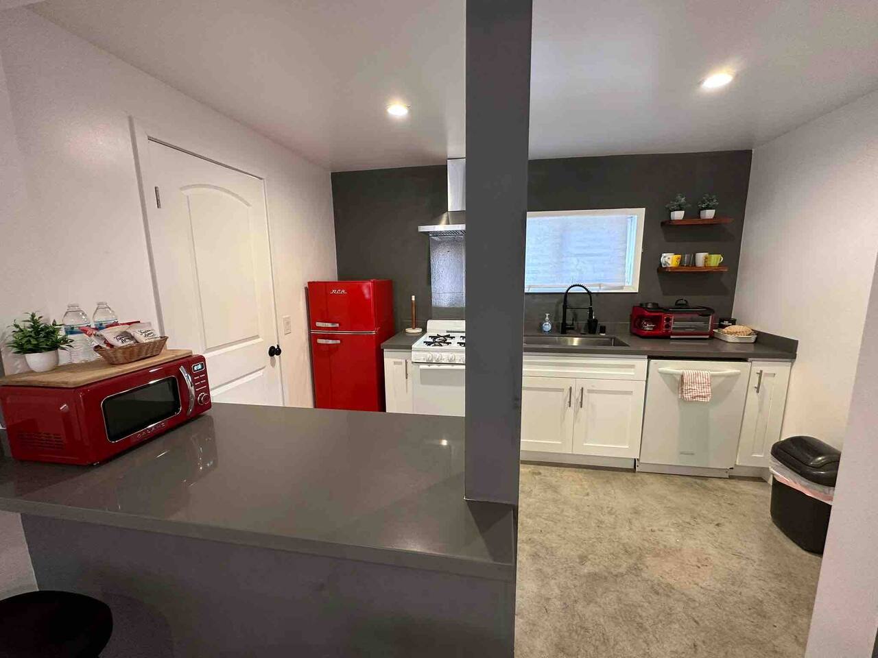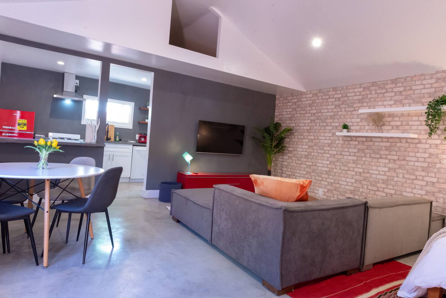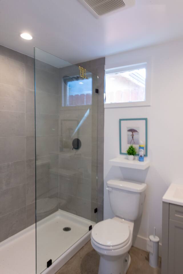 Private cozy guesthouse in Inglewood, minutes from So-Fi Stadium. Features a gated driveway leading to a standalone guesthouse with smooth concrete floors and an open-concept living room, smart TV, streaming, and high-speed Wi-Fi. Includes a Queen bed, fully equipped kitchen with stove, dishwasher, coffee/toaster station, and quartz bar seating. Beautiful bath with walk-in shower, natural light, vaulted ceilings, and a fan. Note: A house is on the other side of the property, but it’s private.
