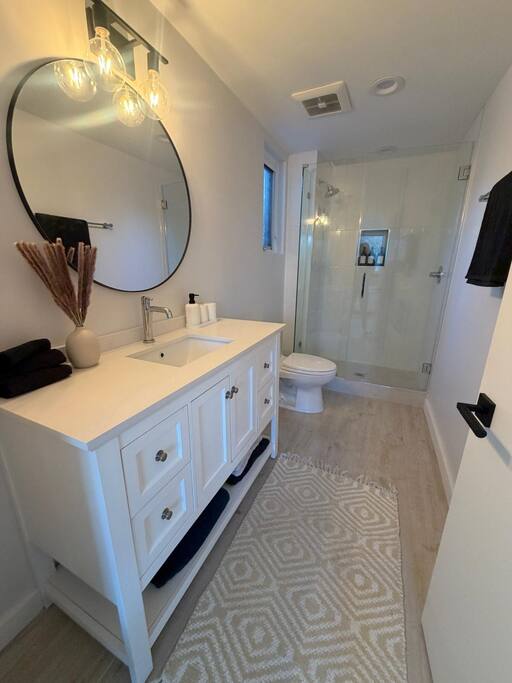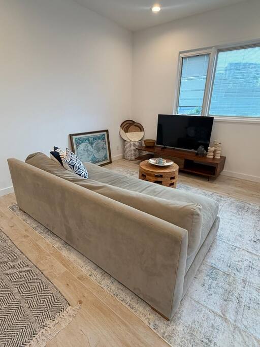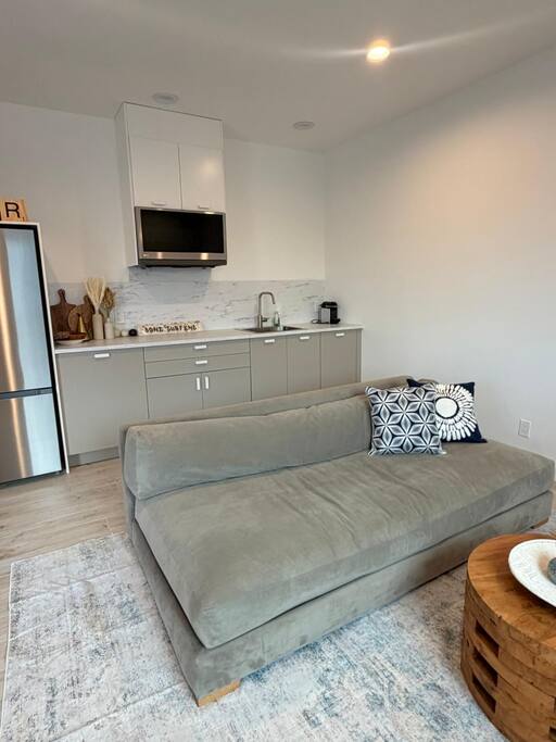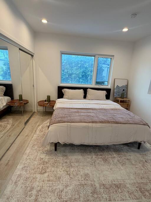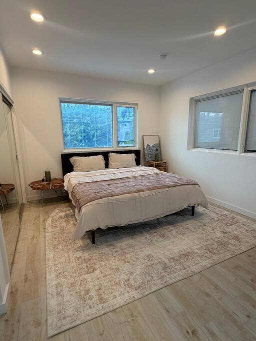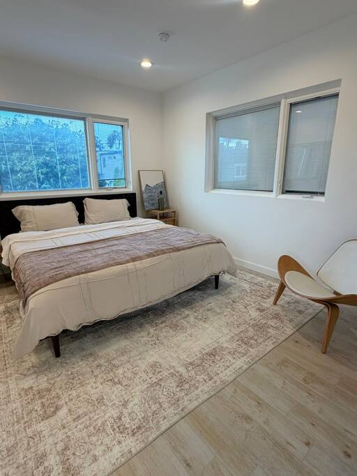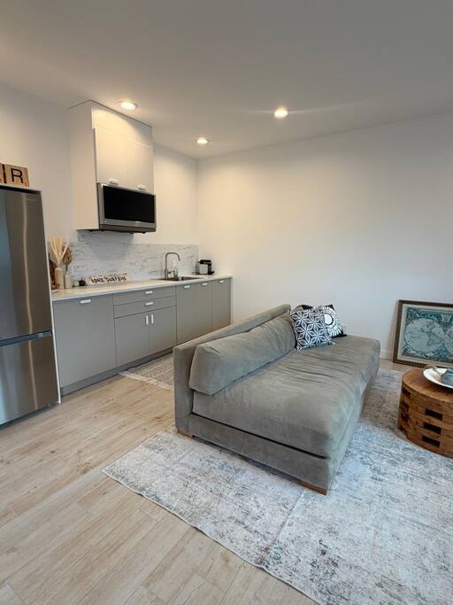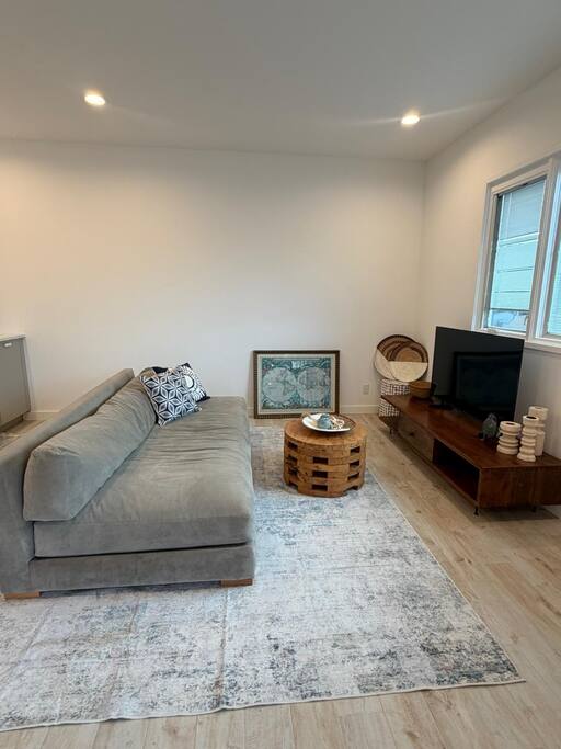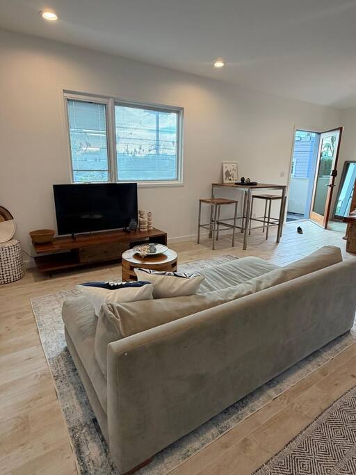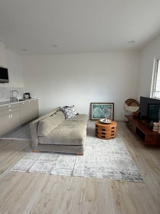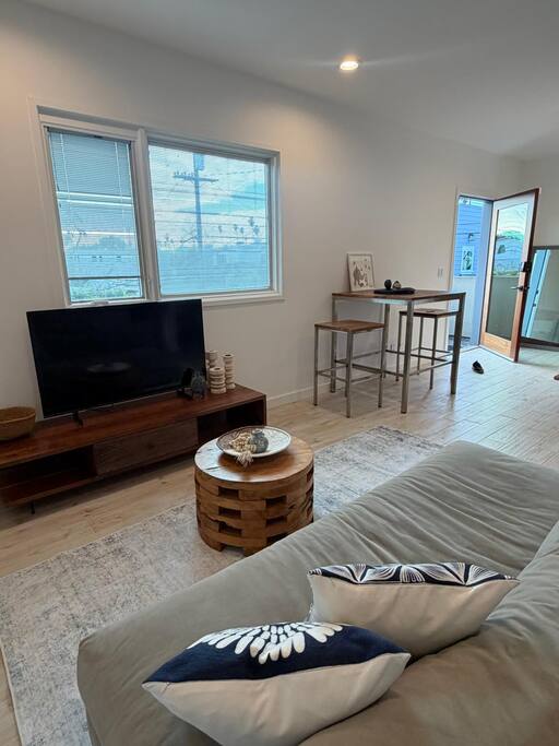Relax in this bright, modern studio located in a quiet back house in Marina del Rey. Thoughtfully designed with clean lines and warm finishes, the space offers comfort, privacy, and everything you need for a short or extended stay. The studio features a comfortable queen bed, a cozy living area with a sofa and TV, and a fully equipped kitchen with full-size appliances, microwave, and coffee maker—perfect for cooking at home. The private full bathroom is sleek and modern, stocked with fresh towels and essentials. Large windows bring in natural light while maintaining privacy, and the peaceful setting makes it ideal for guests looking to unwind after a day at the beach or exploring LA. Highlights: • Quiet, private back-house studio • Full kitchen with modern appliances • Full bathroom with walk-in shower • Comfortable sleeping and living areas • Smart TV & Wi-Fi • Easy access to Venice Beach, Marina del Rey, Santa Monica, and LAX Perfect for solo travelers, couples, or professionals seeking a calm, stylish stay near the coast.