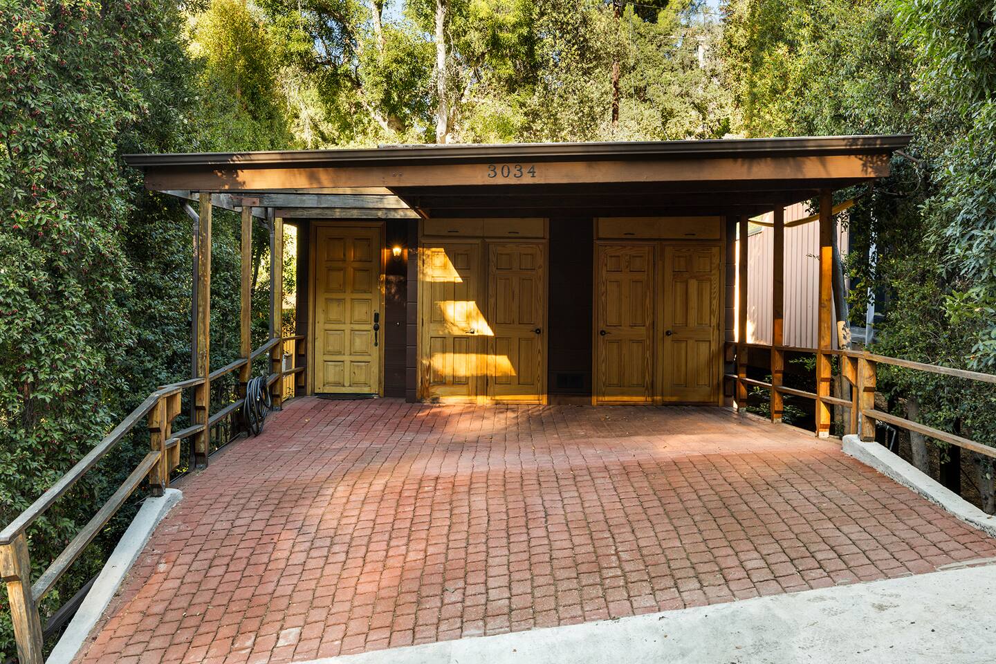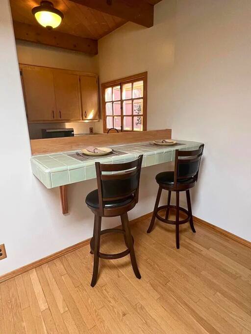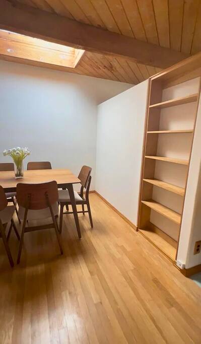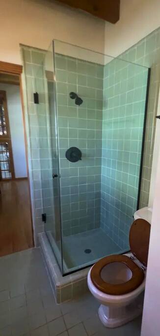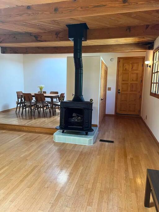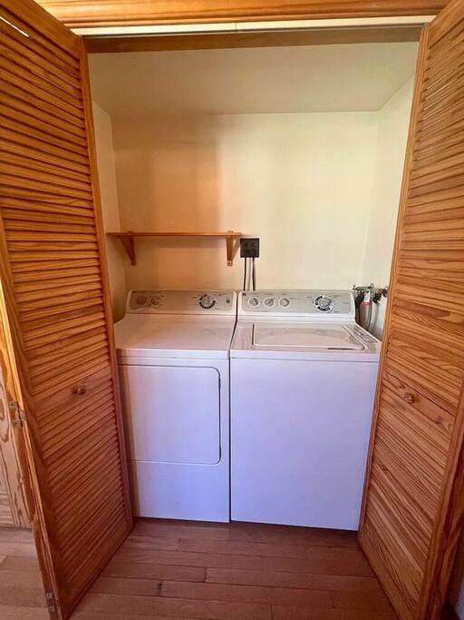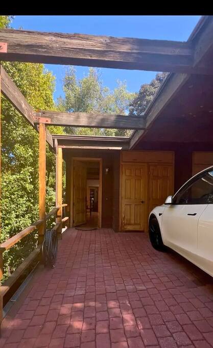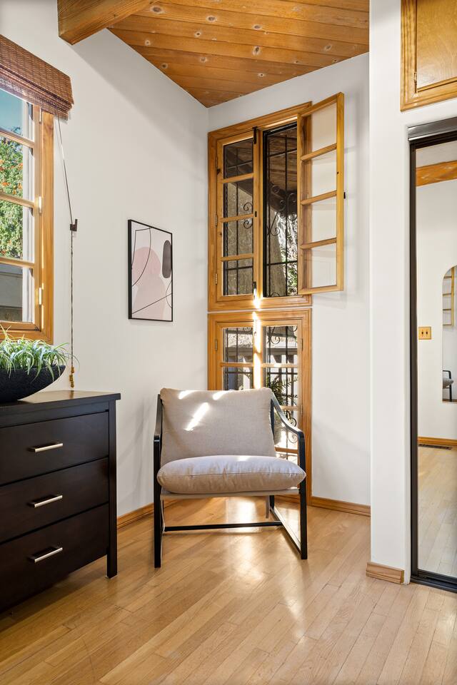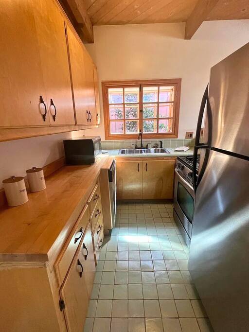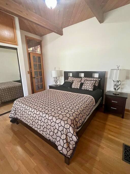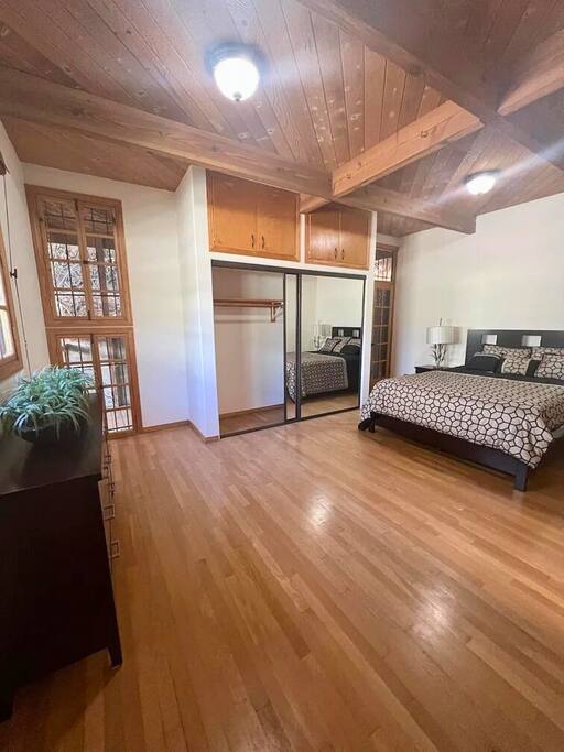 WELCOME HOME! The ENTRANCE AREA welcomes you with a paved path leading up to the front doors, framed by wooden railings and surrounded by lush greenery. This covered entryway offers a private and easy access to the cabin, ensuring a smooth and peaceful arrival. The LIVING ROOM features high vaulted ceilings with exposed wooden beams, creating an open and airy atmosphere. The large comfortable sofa invites relaxation, and natural light fills the space, making it bright and welcoming, perfect for unwinding after a day of exploring. Adjacent to the living room is the DINING AREA, which is elevated slightly, adding to the spacious feel. It includes a dining table that comfortably seats six, ideal for family meals or intimate gatherings. The space is both functional and stylish, making it perfect for shared meals or playing games. The FULLY EQUIPPED KITCHEN is a cook's delight, with modern appliances including a refrigerator, dishwasher, and ample countertop space for meal preparation. A large window overlooks the outdoor area, providing a beautiful view as you cook. The wooden cabinetry and tile floors add a warm, rustic touch to the kitchen. The BEDROOM offers a spacious and inviting retreat, featuring a QUEEN-SIZED BED with stylish bedding. The room is bright and airy, with natural light flowing through the windows and a cozy feel from the high wooden ceilings with exposed beams. The wooden doors lead to a CLOSET, providing ample storage space. Modern furniture, including a nightstand with a lamp, adds a touch of elegance to the room. For your convenience, the cabin includes a WASHER AND DRYER tucked neatly away in a closet, perfect for refreshing your clothes during your stay. The BATHROOM is designed with convenience and style in mind, featuring a walk-in shower with glass panels for a refreshing experience. The stylish sink and toilet are complemented by the wooden accents and neutral tile flooring, adding warmth to the space. Step outside to the PRIVATE PATIO AREA, where you’ll find a small table and chairs. This is the perfect spot for a morning coffee or an evening drink, surrounded by the peaceful atmosphere and natural beauty. Restaurants Nearby: Hugo's West Hollywood Hungry Crowd Red Maple Toluca Lake Beachwood Cafe Hollywood Things to Do Nearby: Griffith Park Warner Bros. Studio Tour Hollywood The Wizarding World of Harry Potter