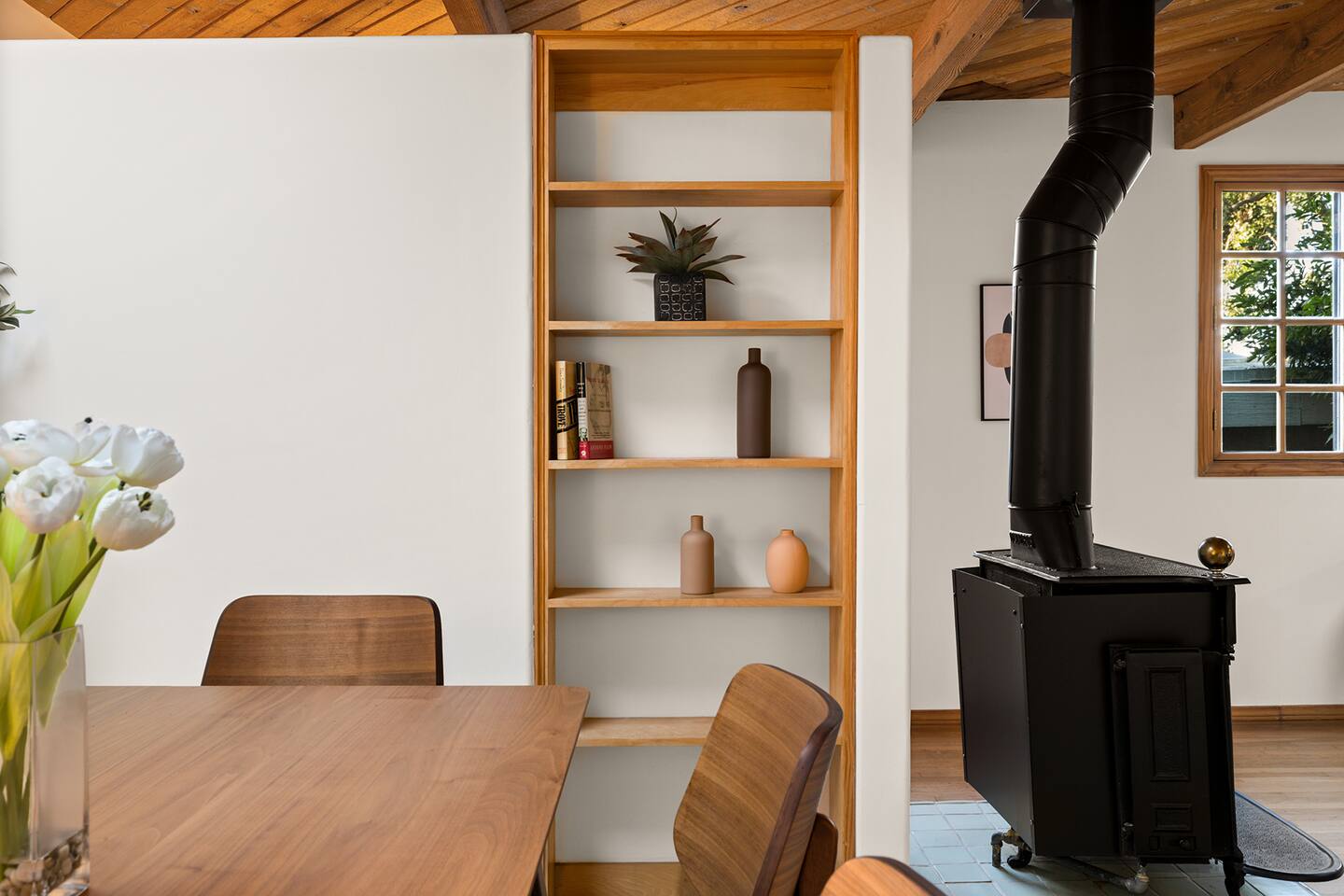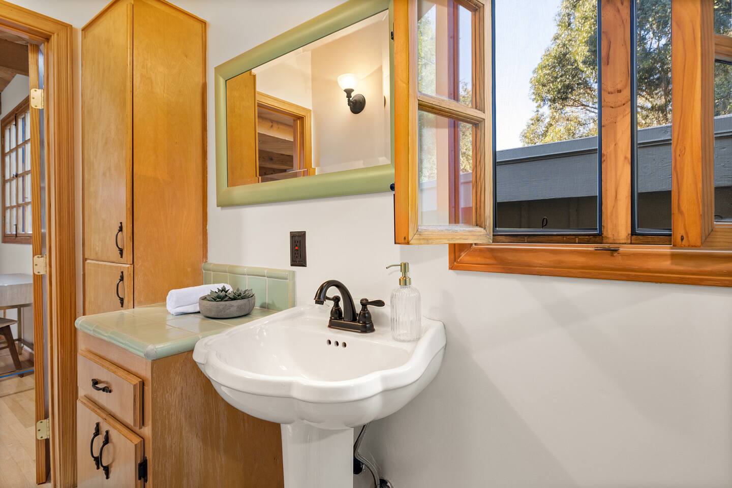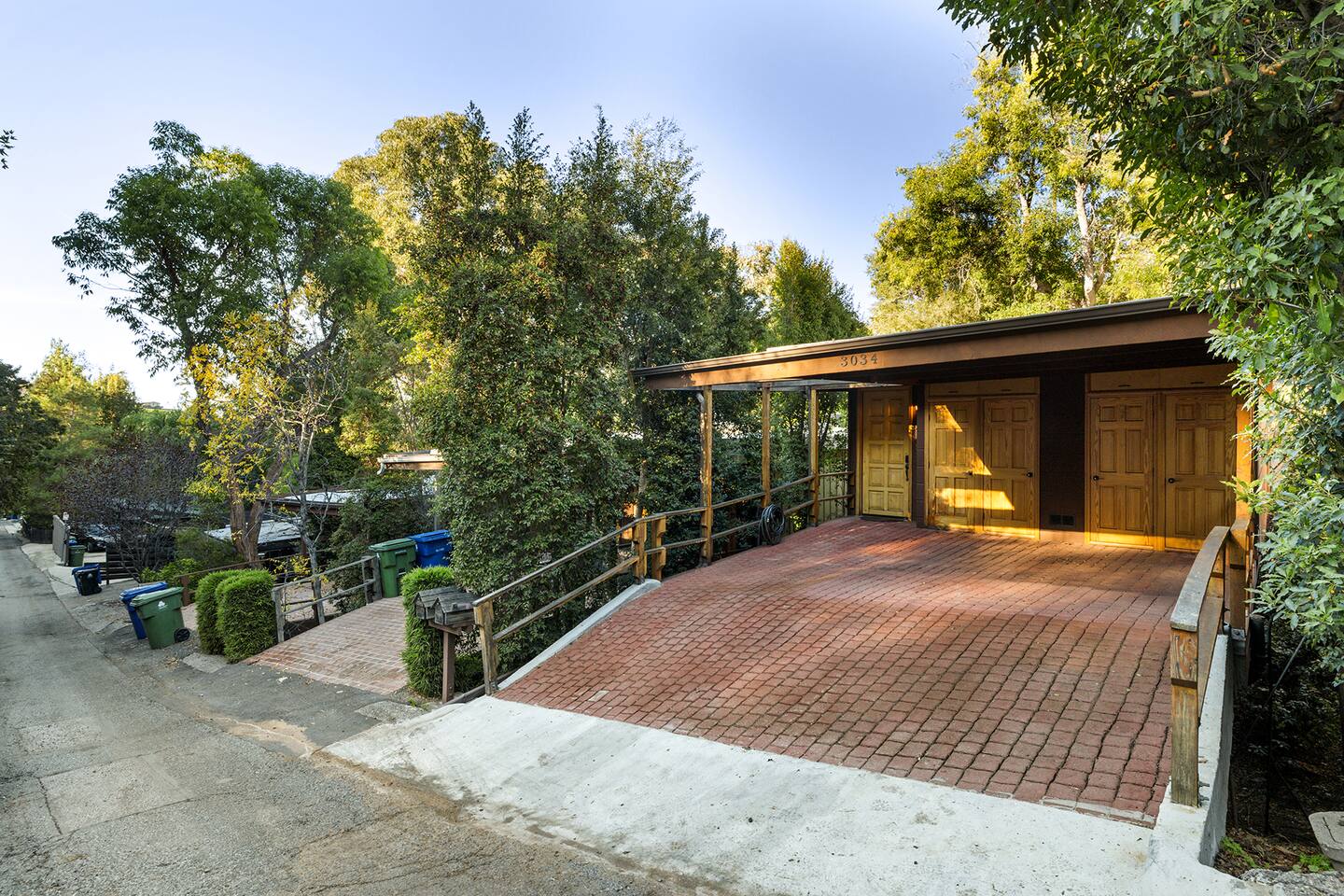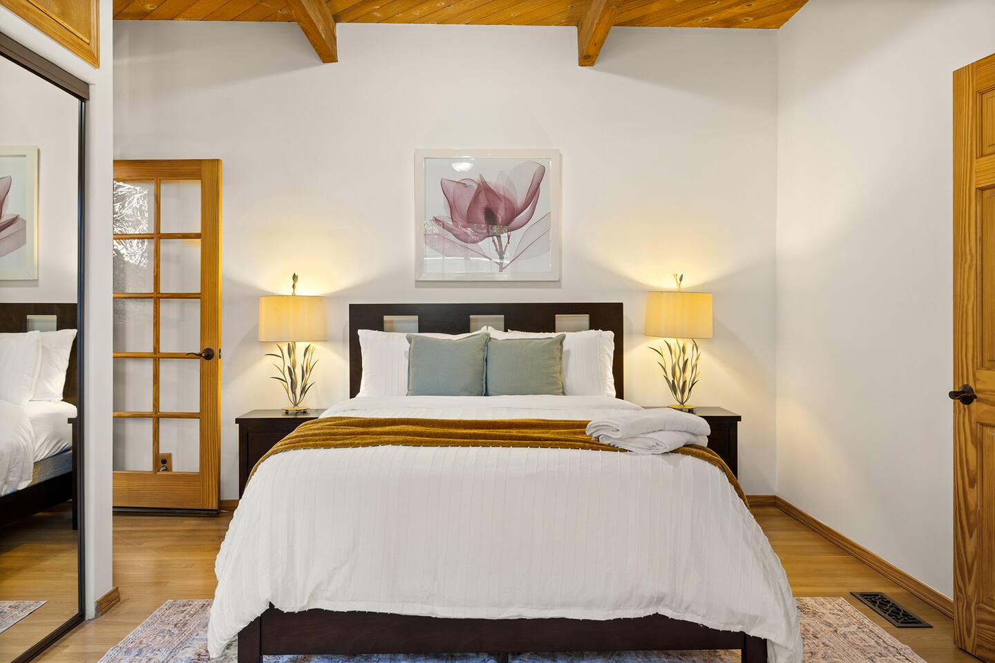 WELCOME HOME! The ENTRANCE AREA welcomes you with a paved path leading up to the front doors, framed by wooden railings and surrounded by lush greenery. This covered entryway offers a private and easy access to the cabin, ensuring a smooth and peaceful arrival. The LIVING ROOM features high vaulted ceilings with exposed wooden beams, creating an open and airy atmosphere. The large comfortable sofa invites relaxation, and natural light fills the space, making it bright and welcoming, perfect for unwinding after a day of exploring. Adjacent to the living room is the DINING AREA, which is elevated slightly, adding to the spacious feel. It includes a dining table that comfortably seats six, ideal for family meals or intimate gatherings. The space is both functional and stylish, making it perfect for shared meals or playing games. The FULLY EQUIPPED KITCHEN is a cook's delight, with modern appliances including a refrigerator, dishwasher, and ample countertop space for meal preparation. A large window overlooks the outdoor area, providing a beautiful view as you cook. The wooden cabinetry and tile floors add a warm, rustic touch to the kitchen. The BEDROOM offers a spacious and inviting retreat, featuring a QUEEN-SIZED BED with stylish bedding. The room is bright and airy, with natural light flowing through the windows and a cozy feel from the high wooden ceilings with exposed beams. The wooden doors lead to a CLOSET, providing ample storage space. Modern furniture, including a nightstand with a lamp, adds a touch of elegance to the room. For your convenience, the cabin includes a WASHER AND DRYER tucked neatly away in a closet, perfect for refreshing your clothes during your stay. The BATHROOM is designed with convenience and style in mind, featuring a walk-in shower with glass panels for a refreshing experience. The stylish sink and toilet are complemented by the wooden accents and neutral tile flooring, adding warmth to the space. Step outside to the PRIVATE PATIO AREA, where you’ll find a small table and chairs. This is the perfect spot for a morning coffee or an evening drink, surrounded by the peaceful atmosphere and natural beauty. Restaurants Nearby: Hugo's West Hollywood Hungry Crowd Red Maple Toluca Lake Beachwood Cafe Hollywood Things to Do Nearby: Griffith Park Warner Bros. Studio Tour Hollywood The Wizarding World of Harry Potter