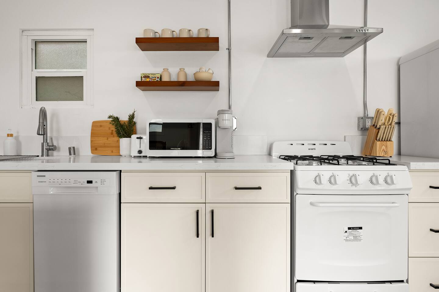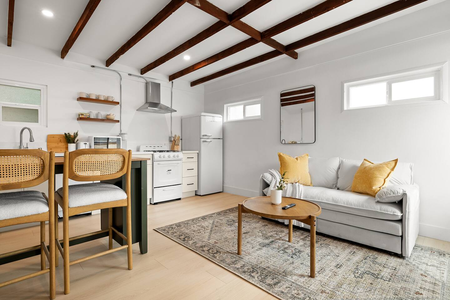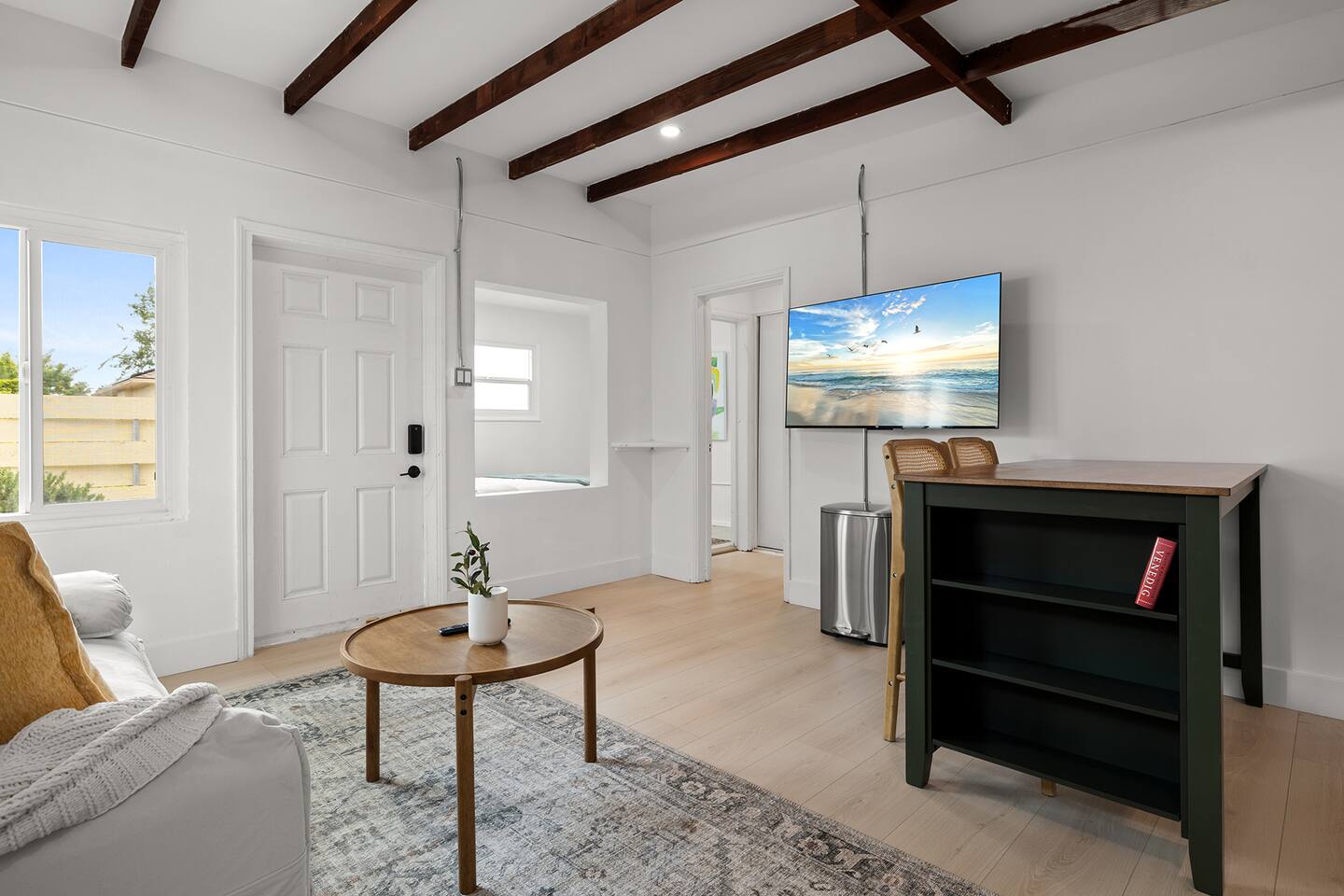 Welcome to your peaceful Inglewood retreat! This calm, stylish 1-bedroom, 1-bathroom home is perfect for solo travelers or couples looking for comfort and convenience. **30 nights minimum, choose 31 nights to remove city tax.** What You'll Love: • Private entrance + spacious yard •1 Queen bed + a pull-out sofa bed • Exposed wood beams & natural light • In-unit washer & dryer • Fully equipped kitchen with vintage-style appliances • Smart TV & dining island — great for meals or remote work • Free street parking • Quiet neighborhood near LAX, SoFi Stadium, and top dining spots Cozy textures, warm wood tones, and cheerful yellow accents create a welcoming, laid-back vibe. Whether you're in town for a quick getaway or a longer stay, this thoughtfully curated space offers everything you need to feel right at home. Places to visit and dine You can enjoy hearty Italian-American dishes at Sunday Gravy, try your luck or catch a bite at Hollywood Park Casino, and experience major concerts and events at the Kia Forum, all within a short distance from your location.